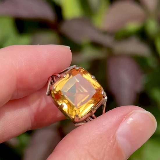 The citrine itself is particularly eye catching: a large, cushion-shaped gem with broad, lively facets that dance with light and fire. Its vibrant golden hue is full of warmth and life, perfectly complemented by the soft glow of antique gold. Such stones were highly prized in the 1830s and 1840s for their sunny colour and symbolic associations with joy and abundance.