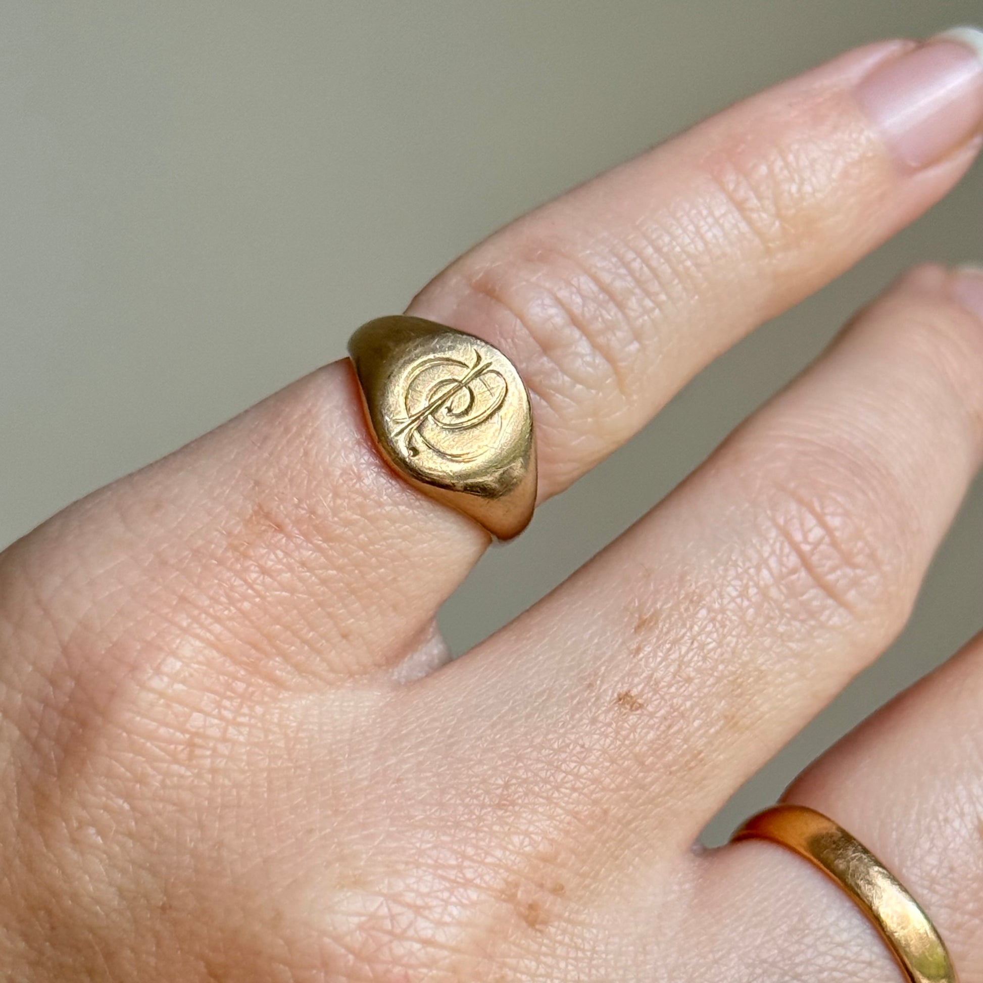A timeless and personal 1930s signet ring, created in a classic rounded tactile design that perfectly captures the understated elegance of the era. The face is engraved with a flowing entwined monogram of the letters ‘O’ and ‘P’, in the soft, fluid style so typical of Art Deco lettering from the period.