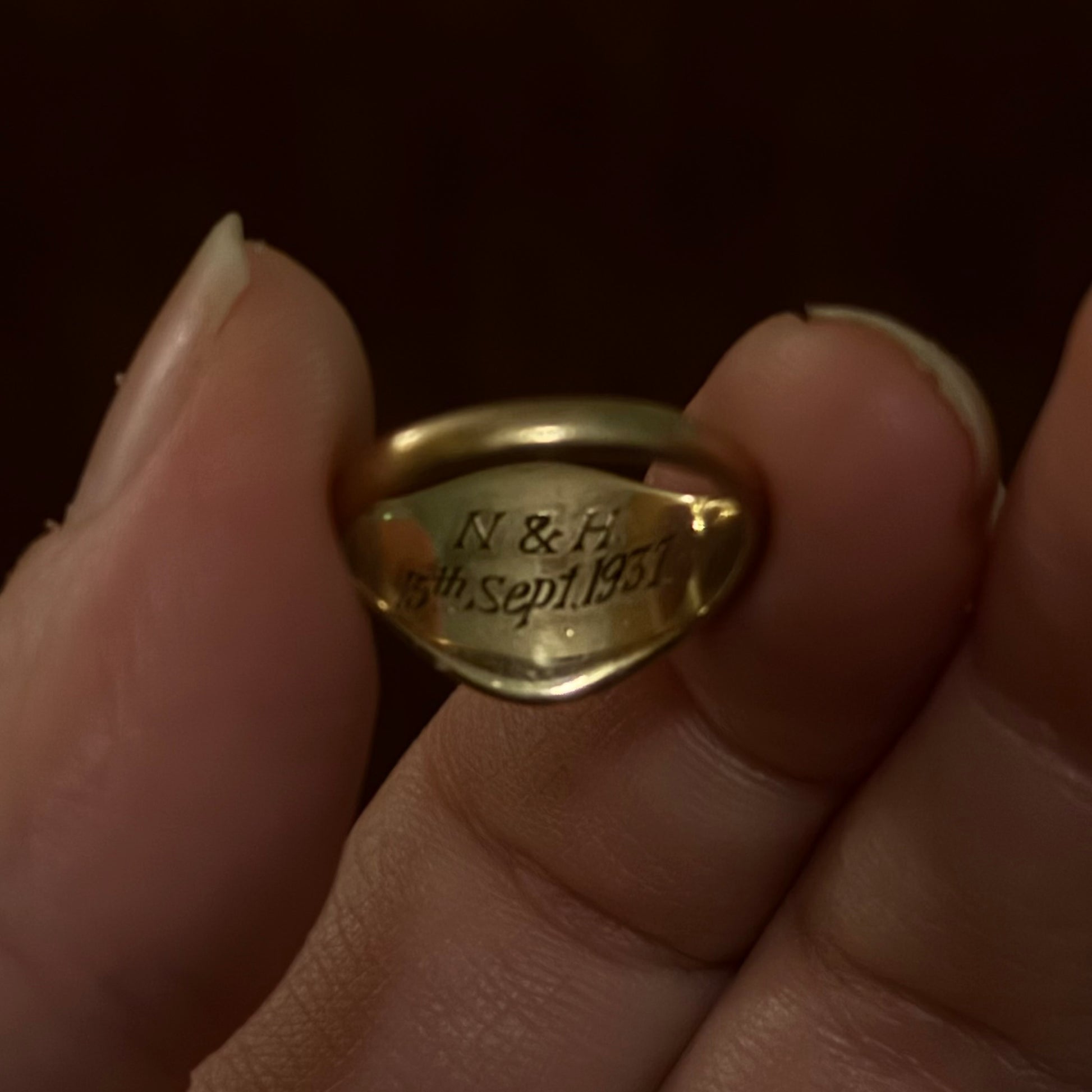 Inside the band lies a charming personal detail. A hand engraved inscription reading “N & H 15th Sep 1937”, adding a romantic glimpse into the ring’s original story and making it all the more special.