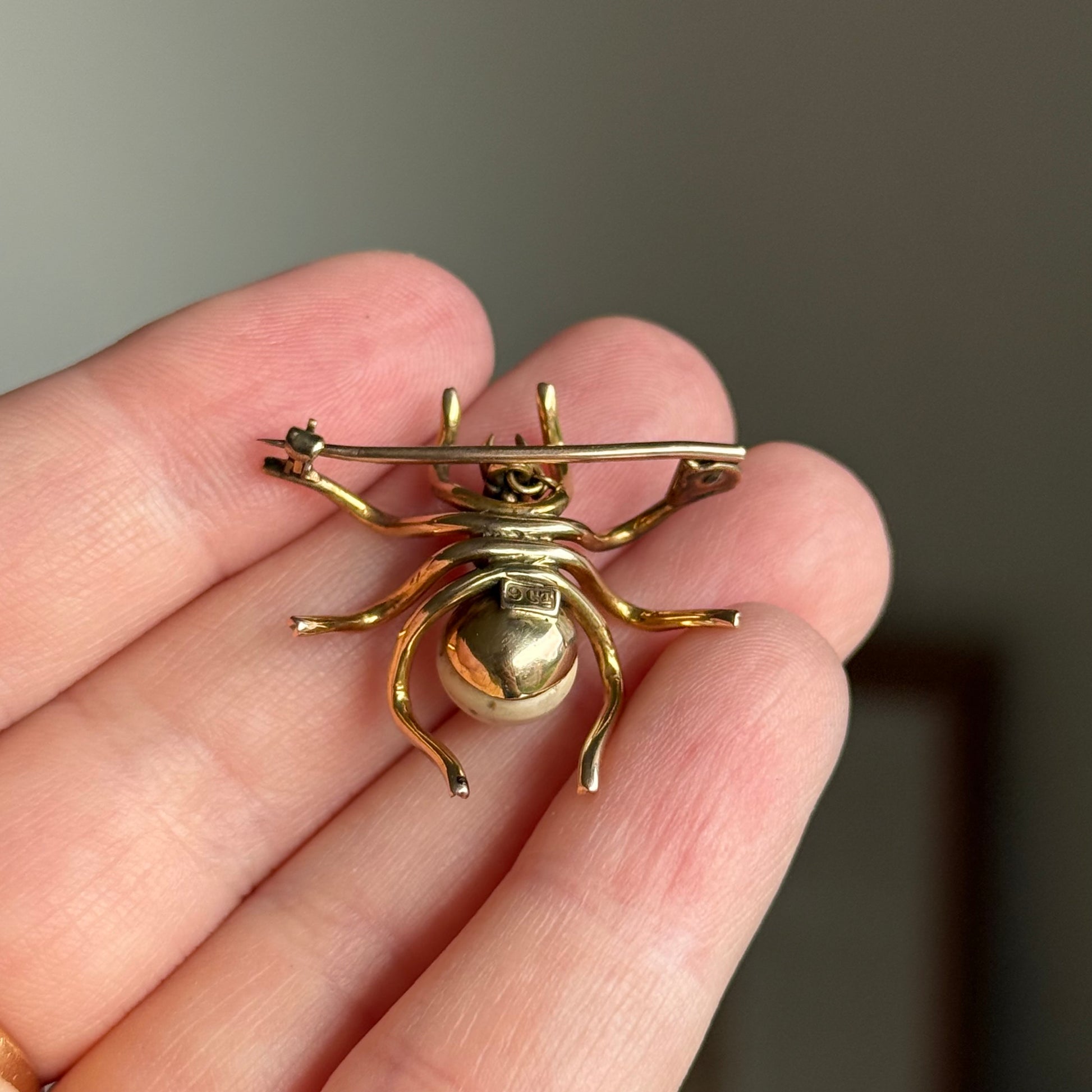 A charming Victorian 9 carat gold spider brooch, designed with exquisite attention to detail and set with two pearls forming the body creating a beautifully lifelike silhouette.