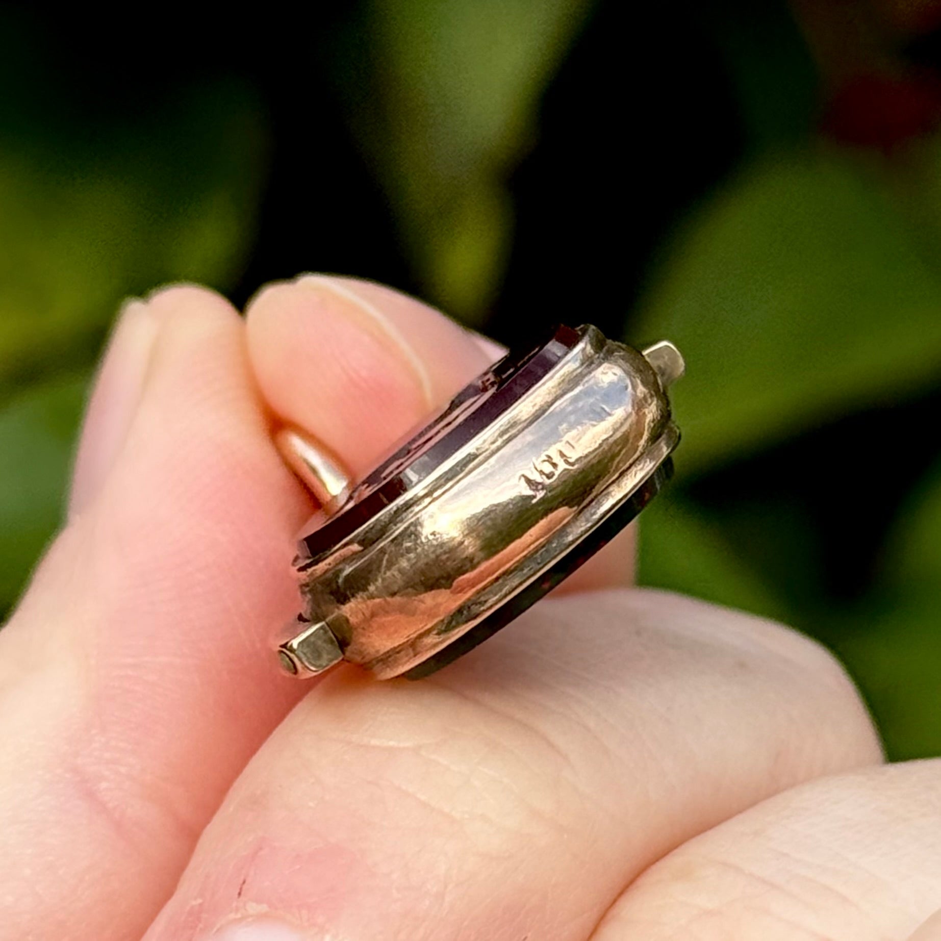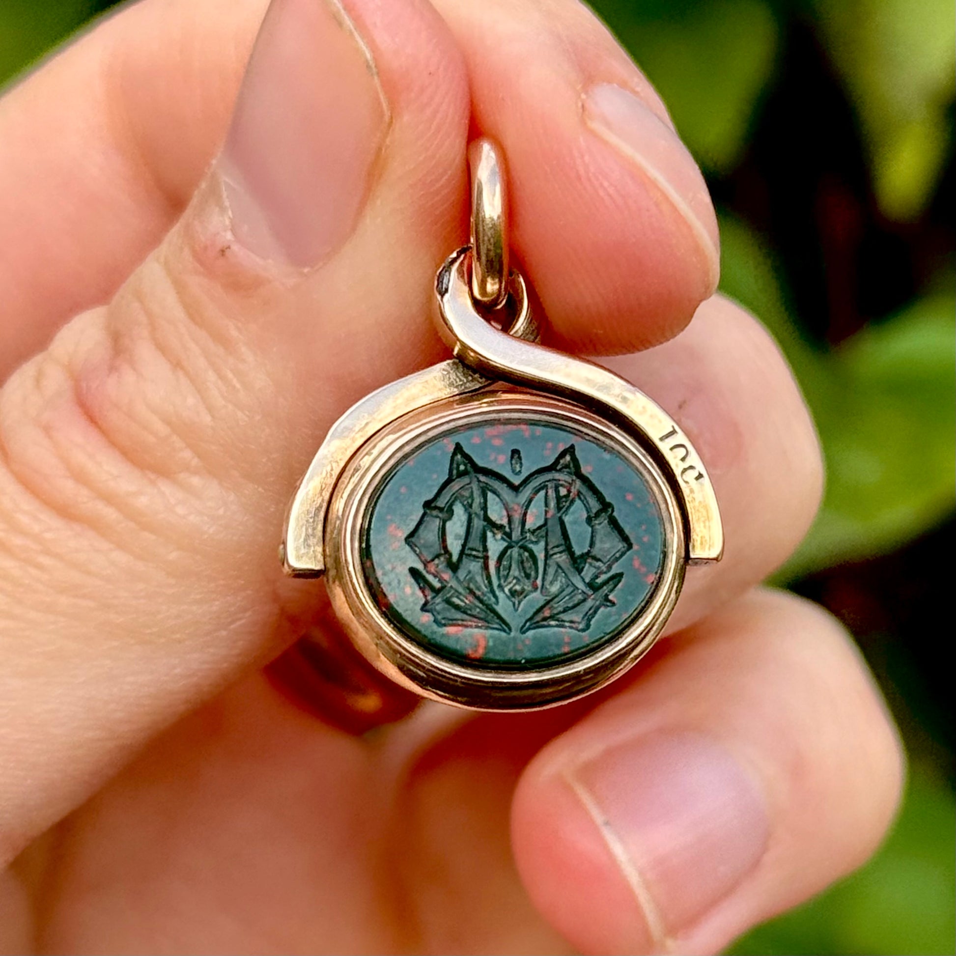 On one side, a deep green bloodstone is carved with an ornate initial. An M or W, depending on how it’s worn its swirling font full of movement and character. On the reverse, a glowing carnelian holds a finely detailed intaglio of a loyal dog, captured mid pose with remarkable skill.