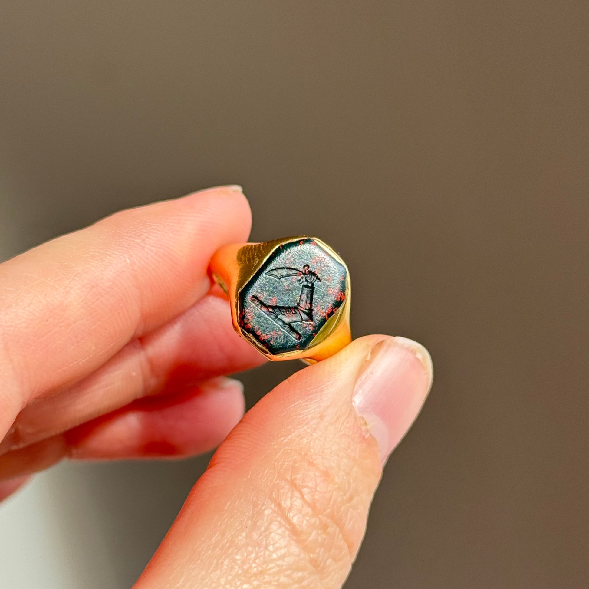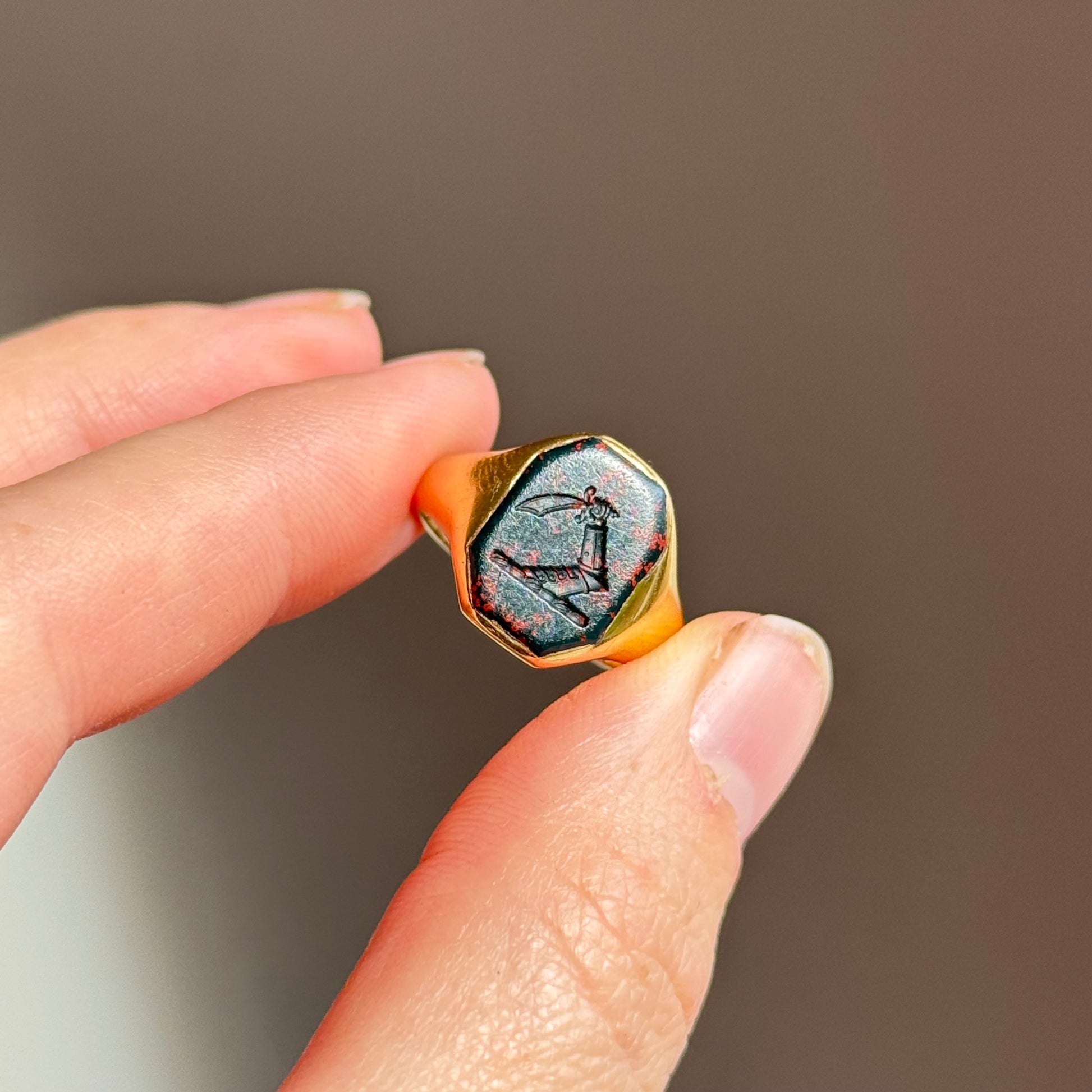 The setting is tactile, with a beautifully solid feel in the hand. The bold, clean shoulders flow seamlessly into the rectangular mount, allowing the carved bloodstone to take centre stage. The deep green of the stone, flecked with red, perfectly complements the warm glow of the buttery gold. It's certainly an eye catcher.