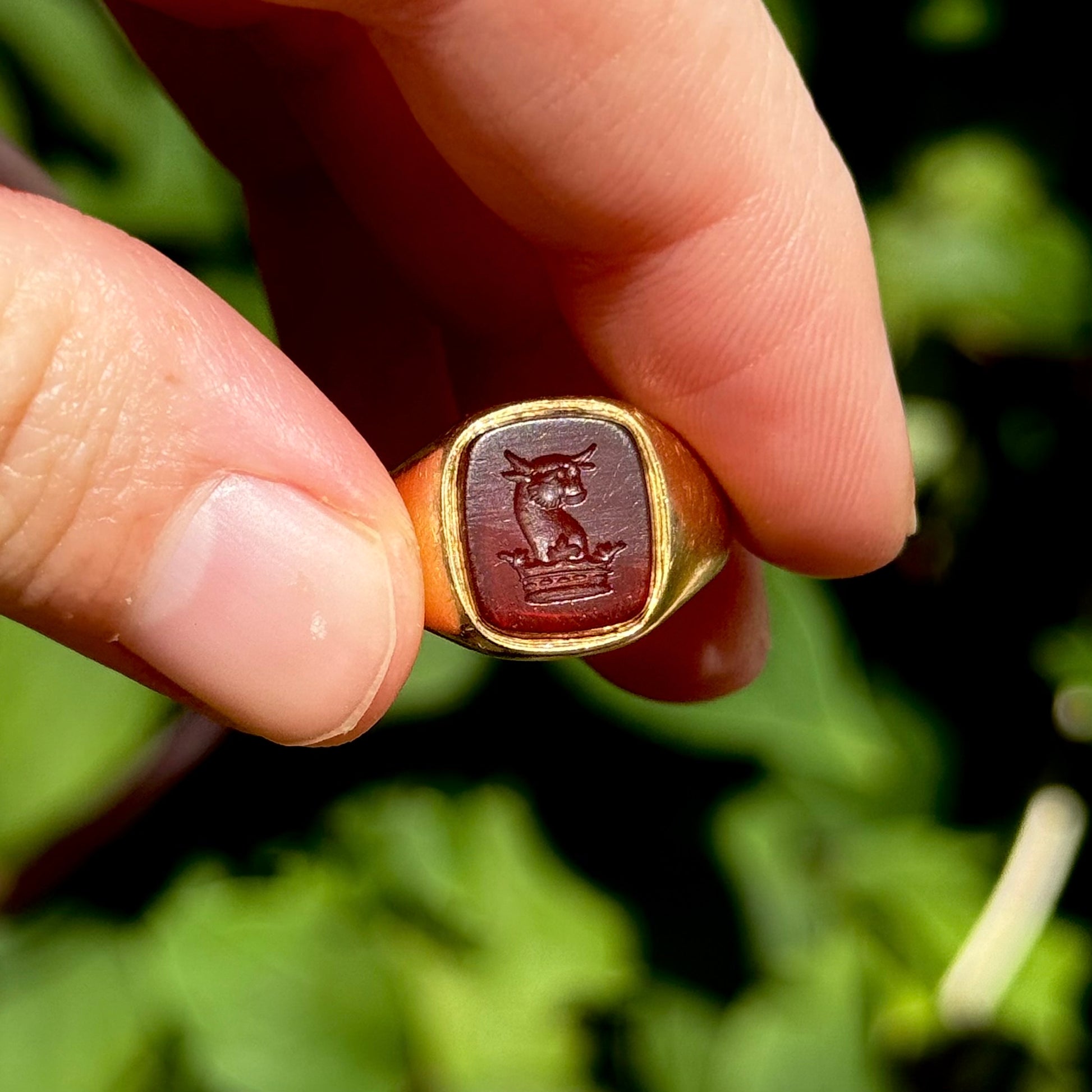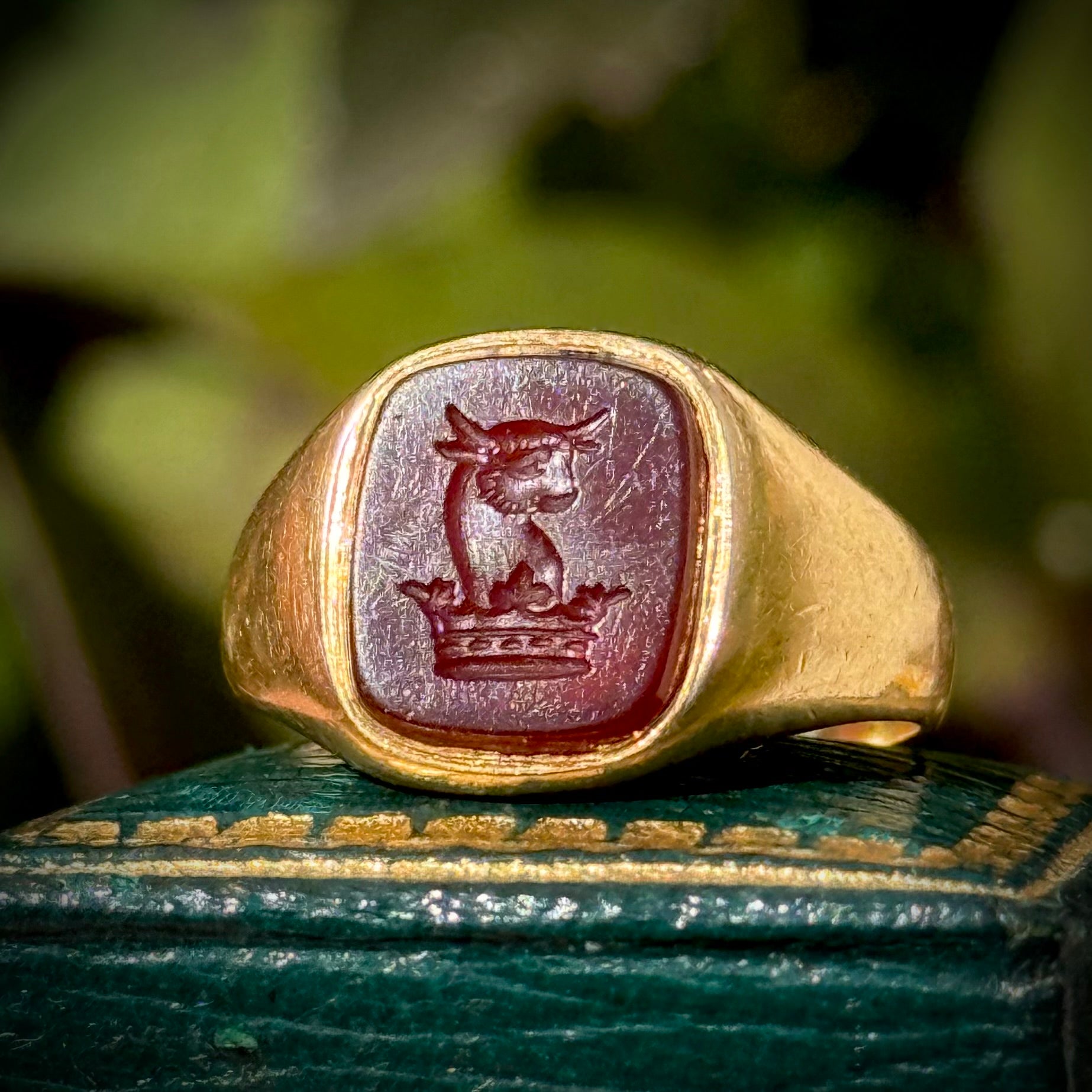A powerful and evocative jewel from the late Victorian era, this exceptional antique signet ring is steeped in history and craftsmanship. Set at its heart is a richly hued cushion cut carnelian. Expertly hand carved with an intaglio depicting a bull’s head rising from a crown; the heraldic crest for the Radcliffe family.
