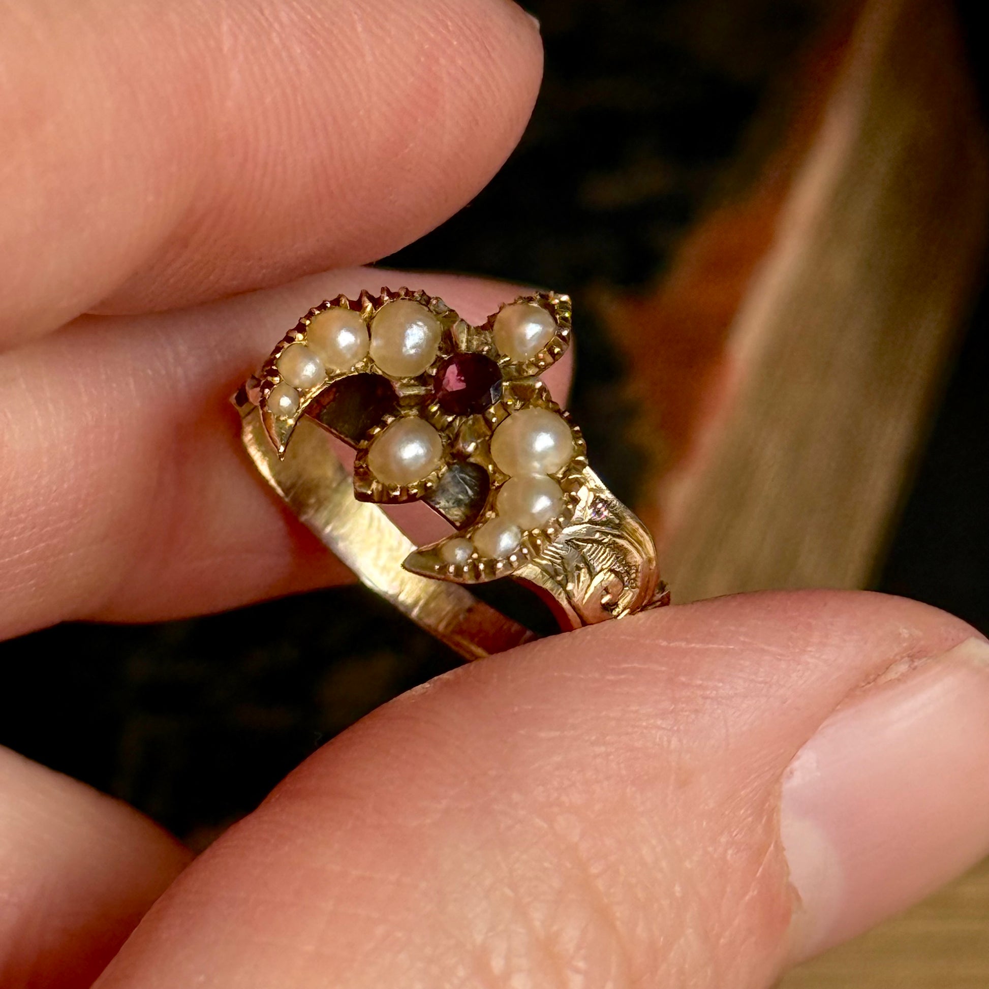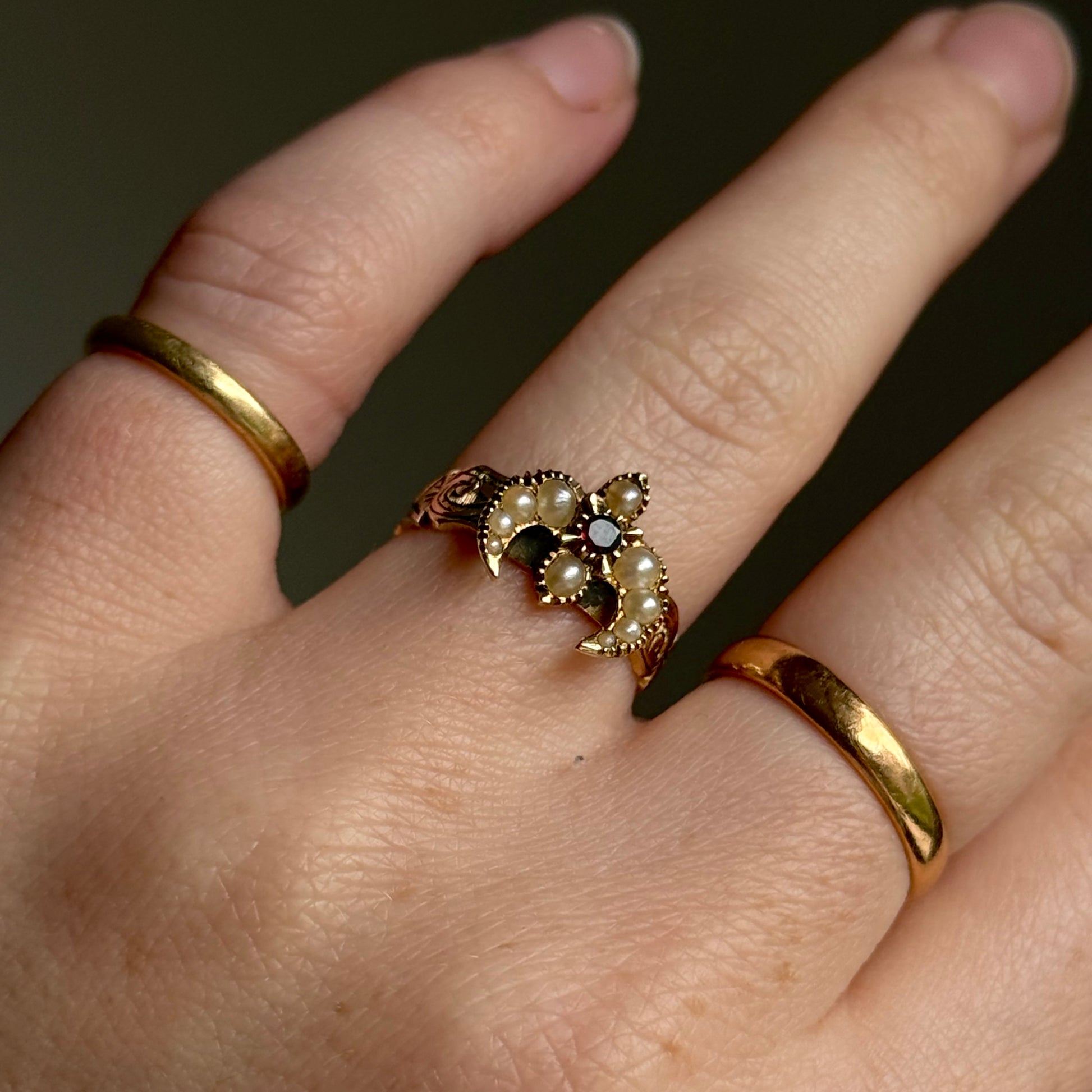 The top of the ring appears to have originally been a tie pin, now beautifully repurposed as the focal point of the design. It is formed as a graceful flying swallow, a much loved motif in Victorian and Edwardian jewellery. The swallow’s body is set with graduating pearls, culminating in a deep red garnet which adds a rich touch of colour and contrast. The gentle curve of the bird in flight gives the ring a wonderful sense of movement and elegance.