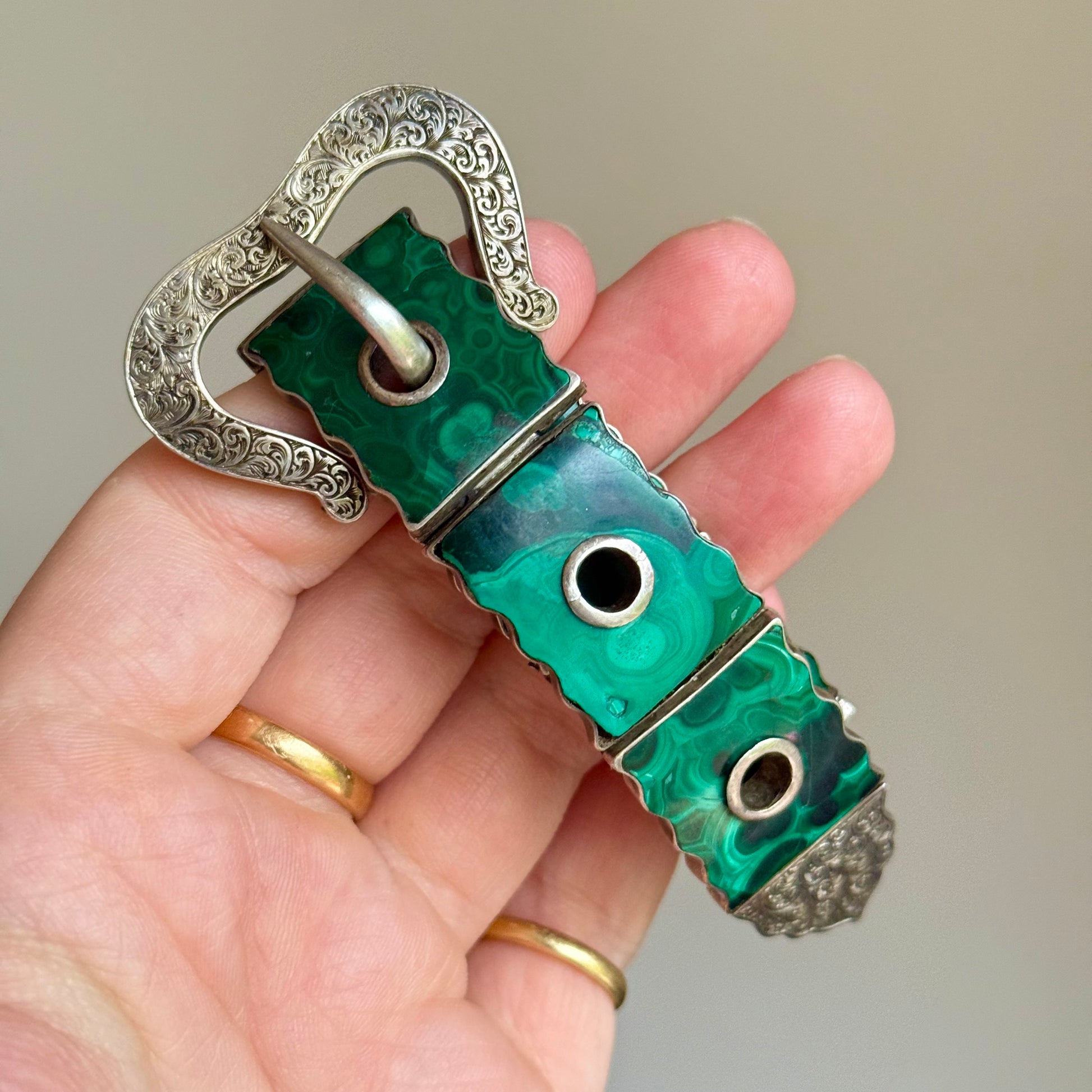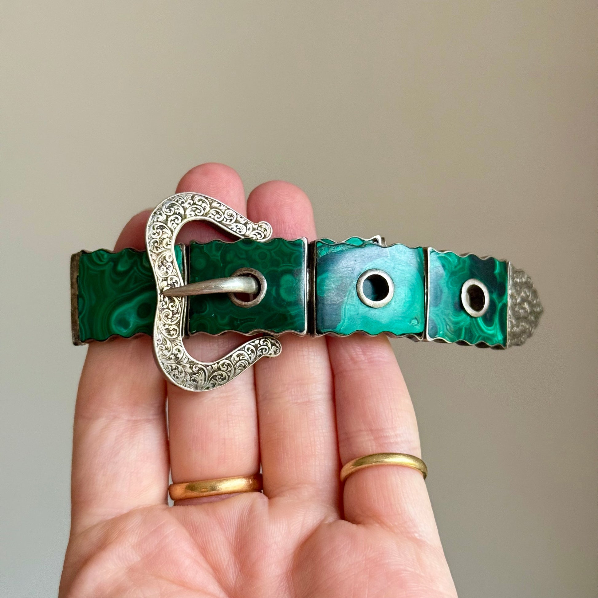 A superb antique malachite and fresh silver buckle bracelet. Created in Continental Europe in the late 19th to early 20th century. This striking piece features rectangular panels of natural banded malachite, each set into scalloped silver mounts, displaying the stone’s characteristic concentric greens and rich colour contrast.