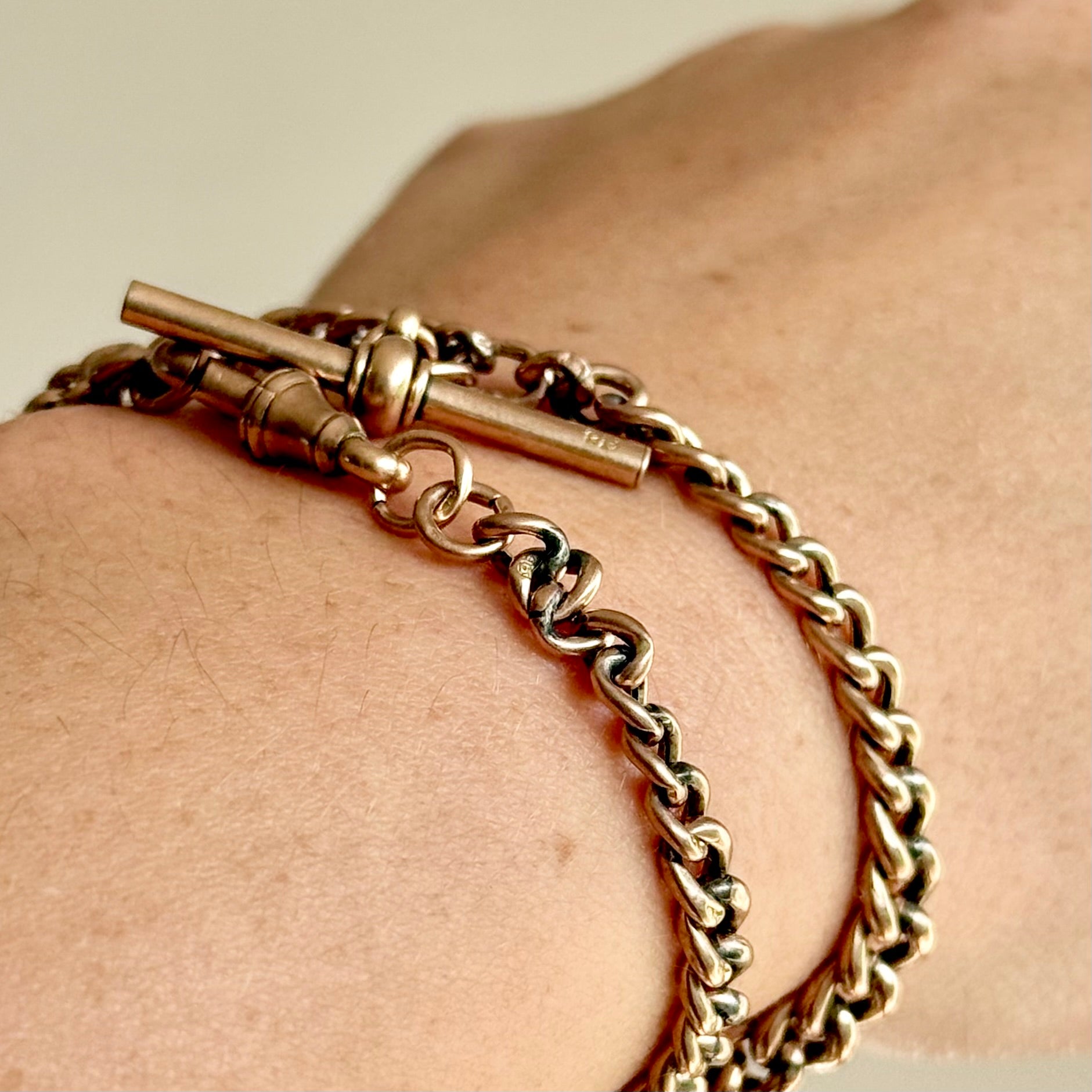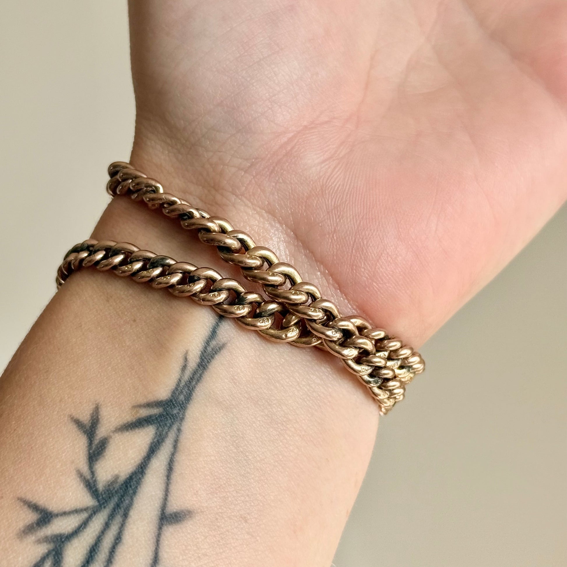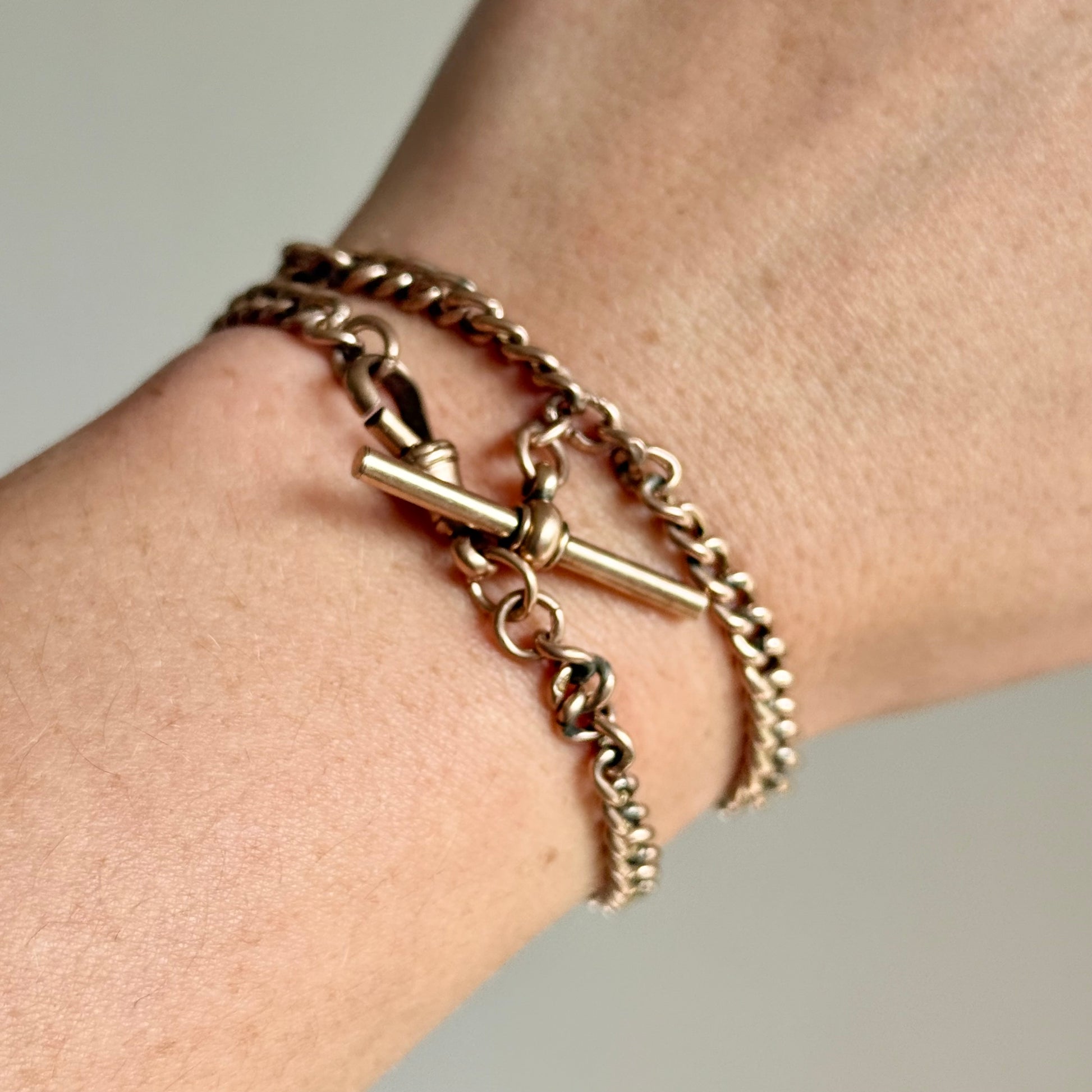 Originally designed as a gentleman’s watch chain, this smaller version offers endless styling possibilities today. Its smaller scale makes it perfect to wear double wrapped as a bracelet or styled as a choker necklace. For those who love to experiment with antique pieces, it can also be extended with a brooch, locket, or chain extender, creating a unique and personal piece of jewellery.