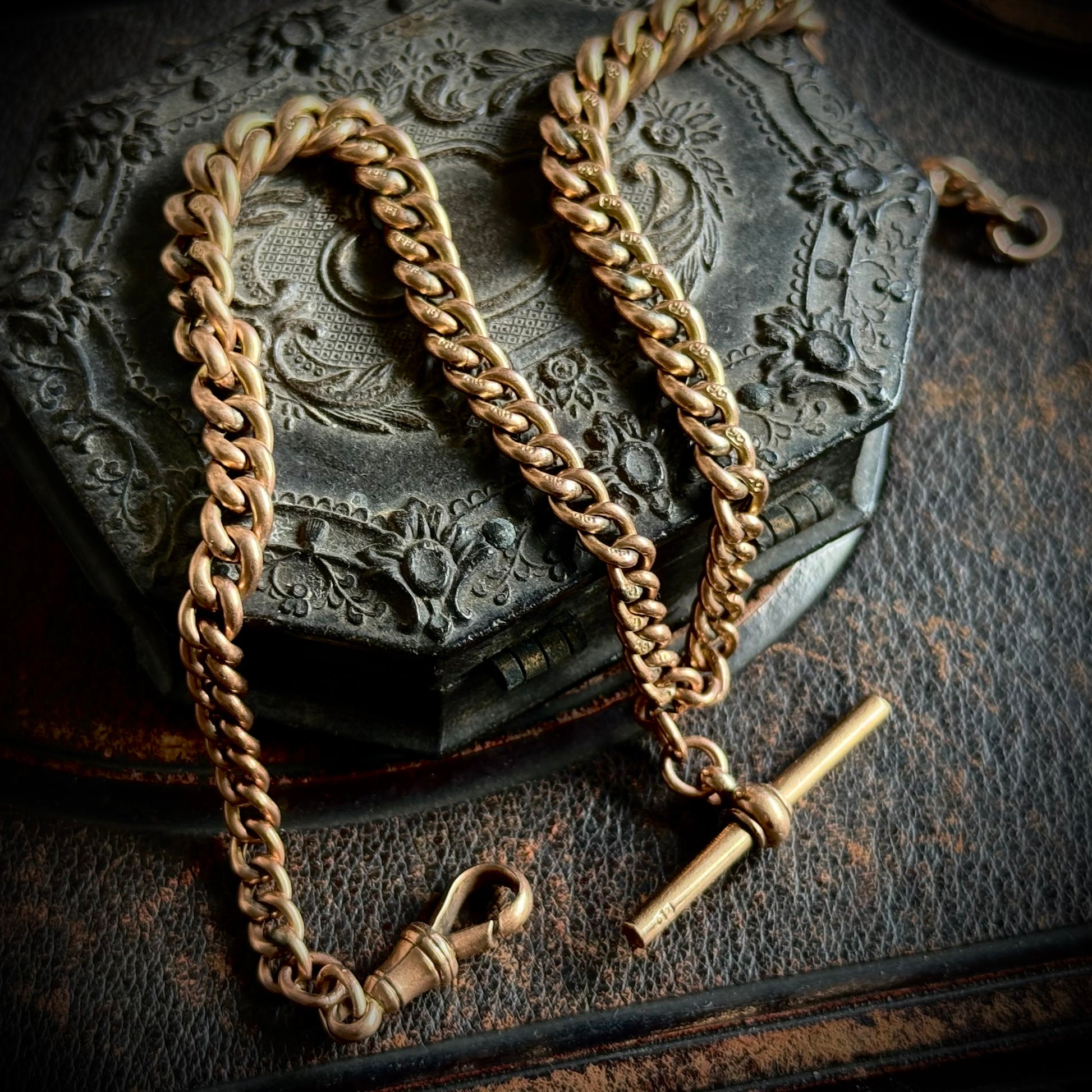 The chain is finished with a dog clip clasp at one end and a classic T-bar at the other. Every link is individually stamped with the 9ct gold mark, a wonderful detail rarely seen on later chains. Weighing 14 grams, it has a pleasing, substantial feel without losing its refined delicacy.