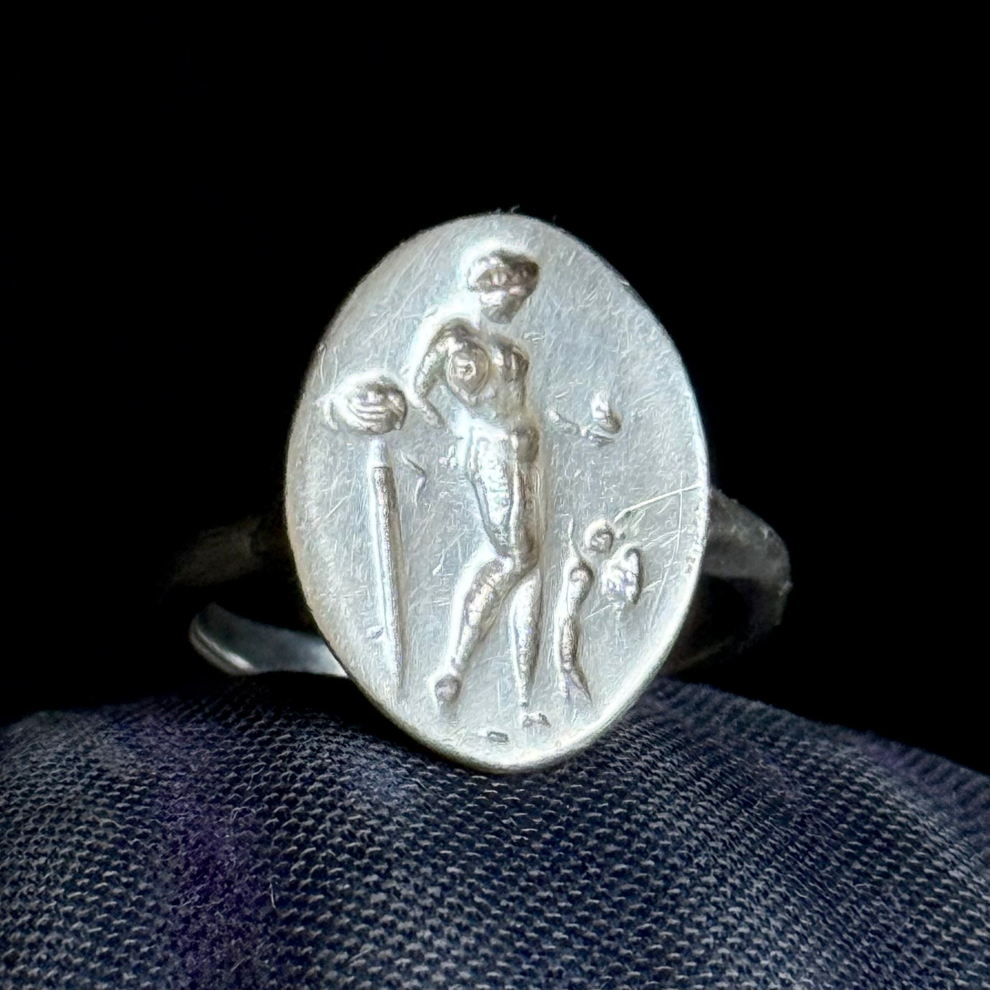 Set into a smooth, weighty silver mount, the ring has a strong, clean profile that beautifully frames the carved scene. A wearable ring with huge influence from thousands of years ago.