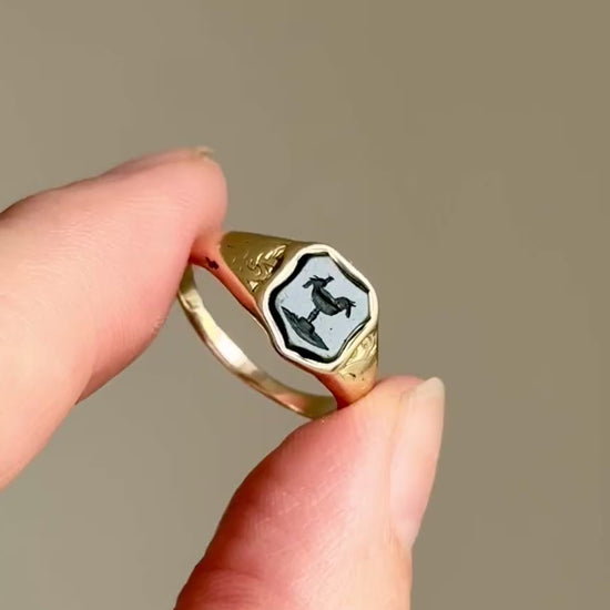 A charming and deeply symbolic piece of sentimental Victorian jewellery, this petite signet ring is created in 9 carat gold and set with a finely carved bloodstone intaglio. The tiny scene engraved into the stone is exquisite in its detail. Cut by hand it depicts two birds perched at a fountain or bird bath, one bending to drink.