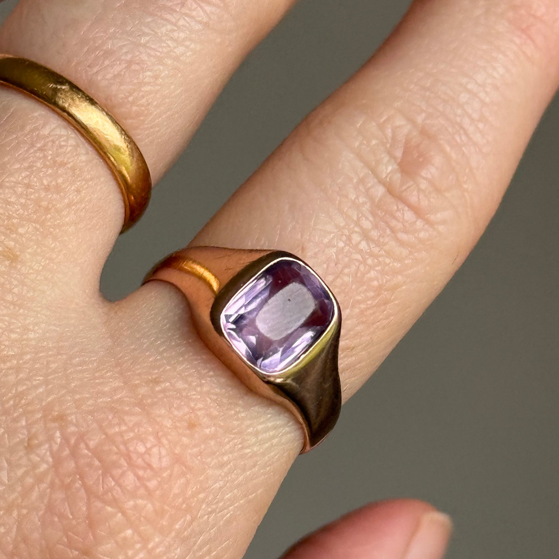 The proportions and design give the piece a classic signet ring feel. Bold yet understated, and effortlessly wearable. The smooth gold shoulders frame the amethyst perfectly, allowing the stone’s delicate colour to remain the focal point.