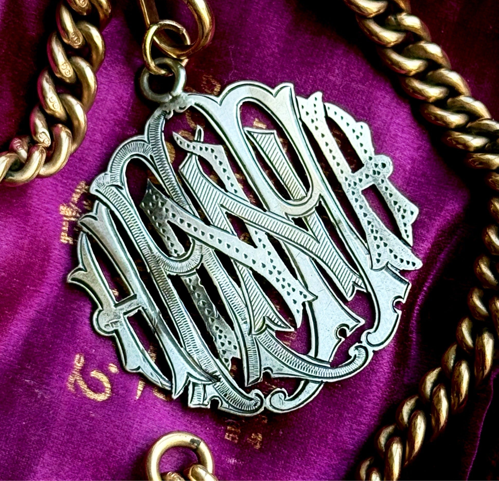 Crafted in the late 19th century, this finely detailed piece showcases the hallmark artistry of the period featuring ornate, gothic-style lettering that intertwines gracefully to form the name. The flowing swirling letters are wonderfully intertwined with some letters being polka dot, plan and some engraved.
