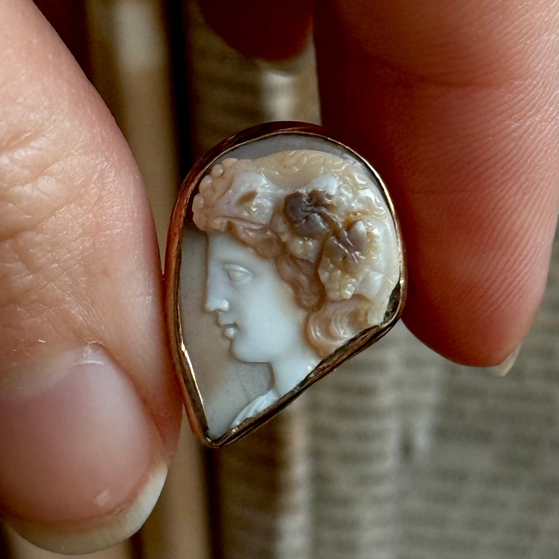 The cameo depicts a female head in profile, exquisitely rendered with delicate classical features. Its character and form suggest it may have originated as part of a larger cameo, perhaps repurposed into this ring by a traveller returning from the Grand Tour, when such pieces were collected as mementoes of classical art and culture.