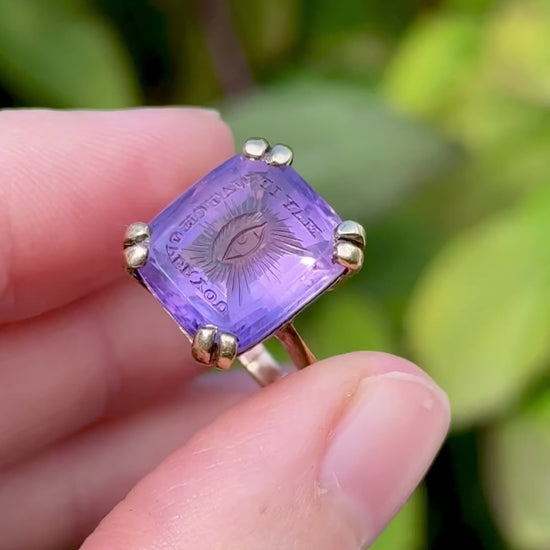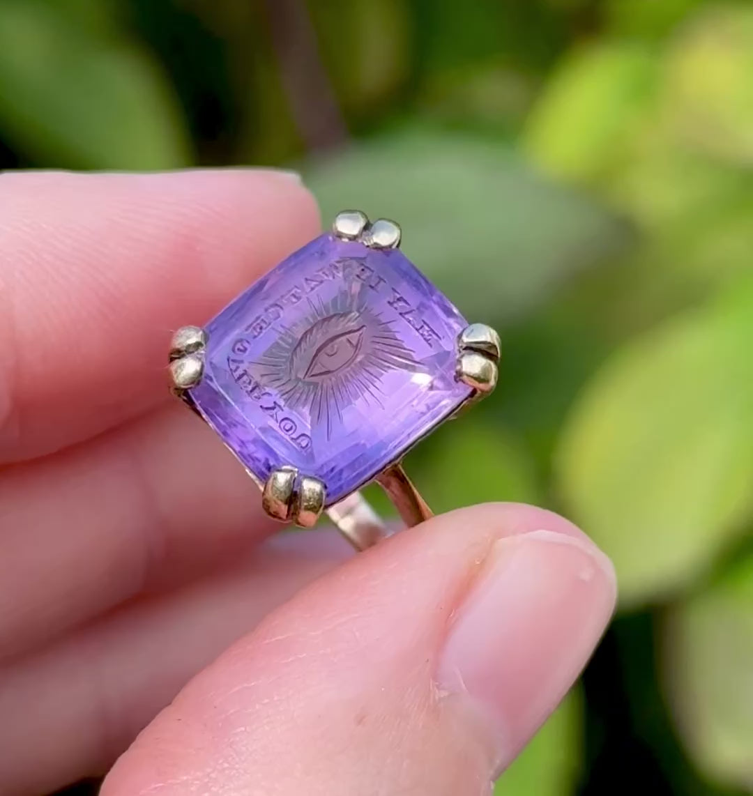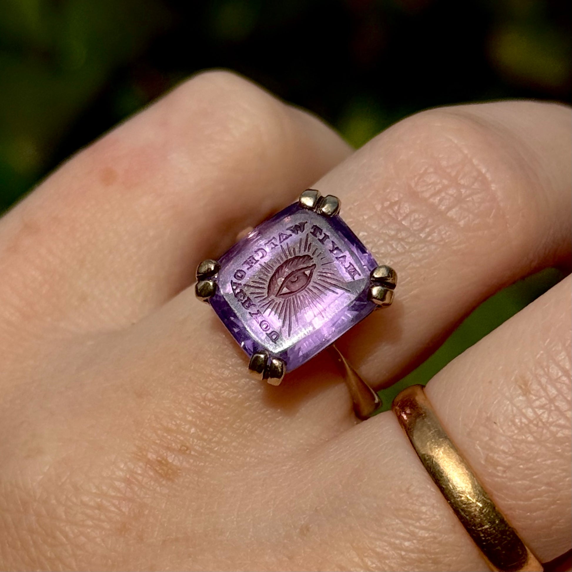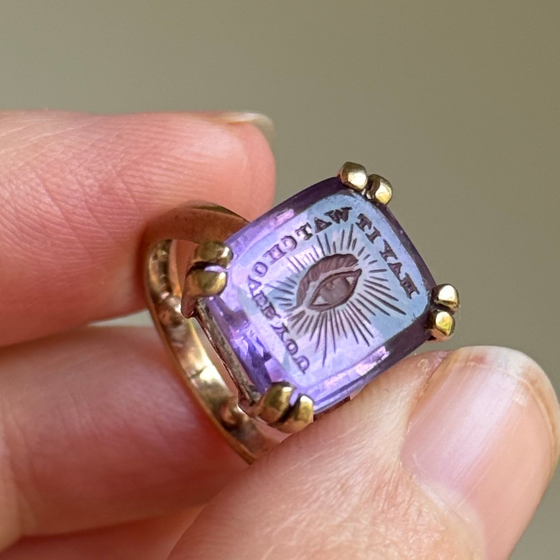 The amethyst is beautifully engraved with a single, watchful eye surrounded by the motto 'May it watch over you'. Deeply symbolic, the image of the eye has long represented protection, insight, and divine watchfulness, acting as a charm against harm or misfortune. Paired with the tender motto, the message becomes one of care and guardianship. A reminder that one is seen and safe.