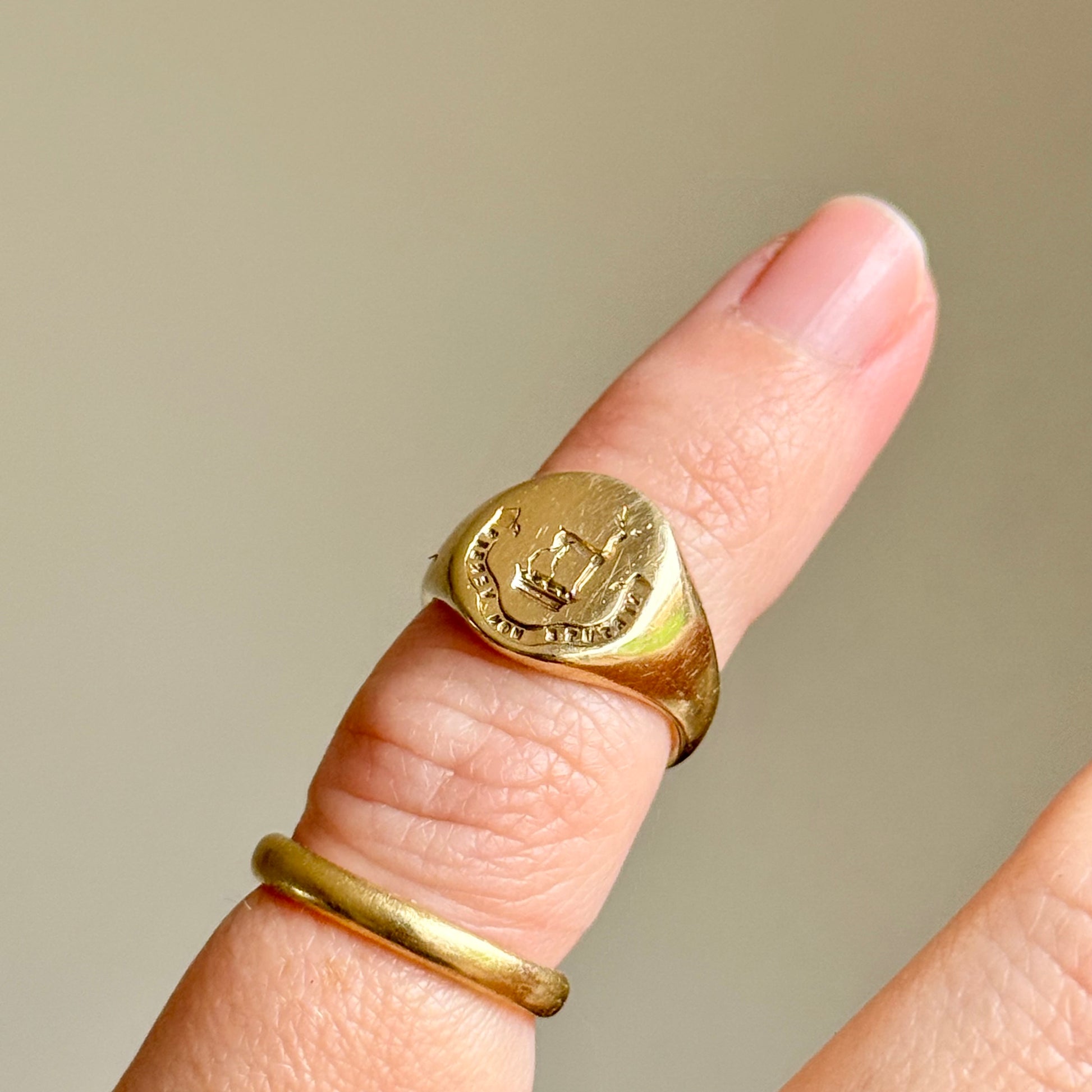 A ring of presence this antique signet ring is a tactile piece of heraldic history which is rich in symbolism and craftsmanship. Created in 9 carat yellow gold, it bears an ornately engraved family crest: a stag and crown above the Latin motto “Virtute non verbis” — “By courage, not words.”