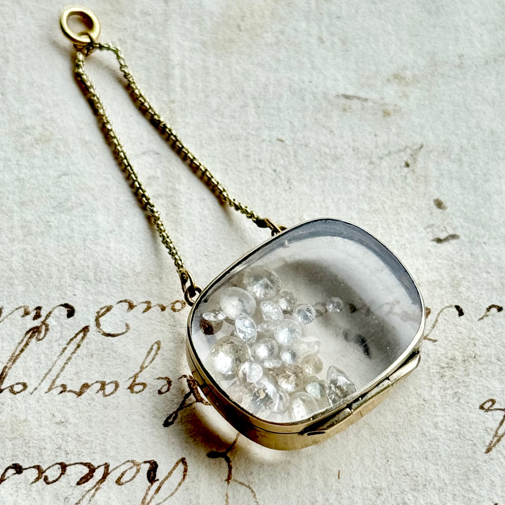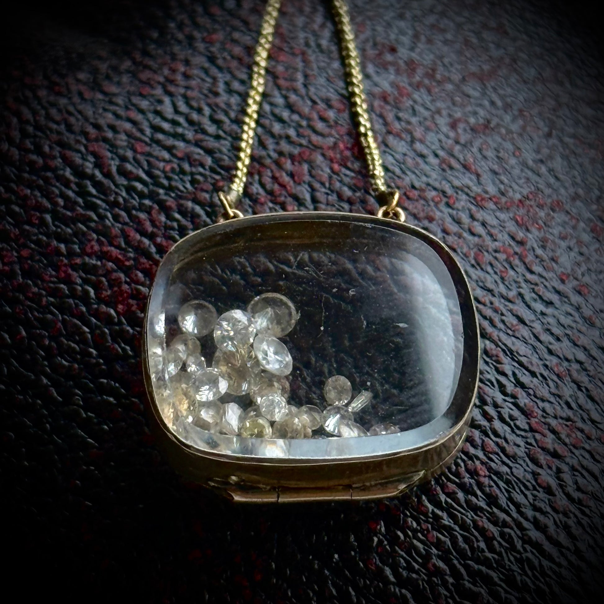 Inside, a small selection of loose antique diamonds has been placed, catching the light and adding a touch of sparkle — though the compartment can just as easily hold a lock of hair, miniature portrait, or other sentimental token.