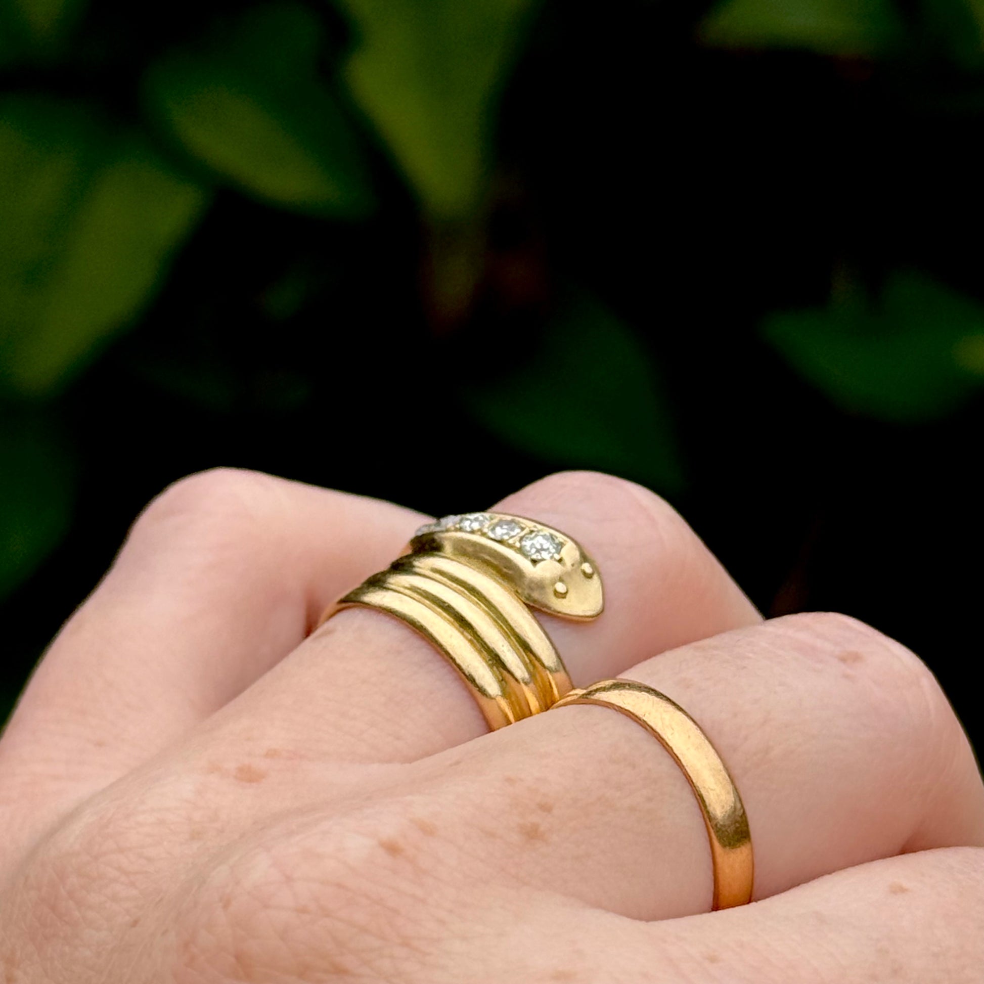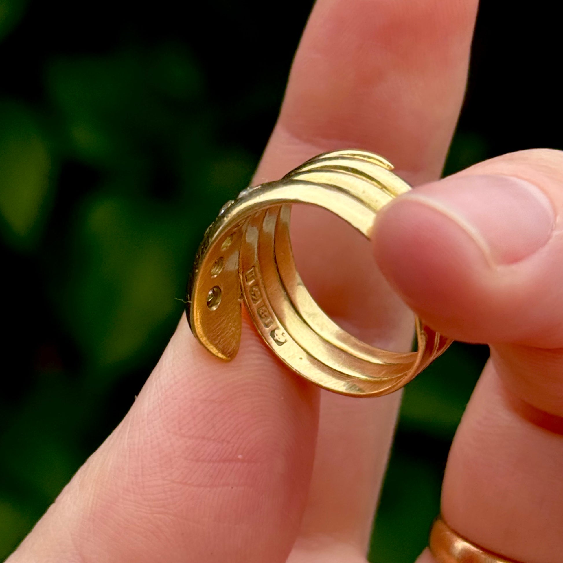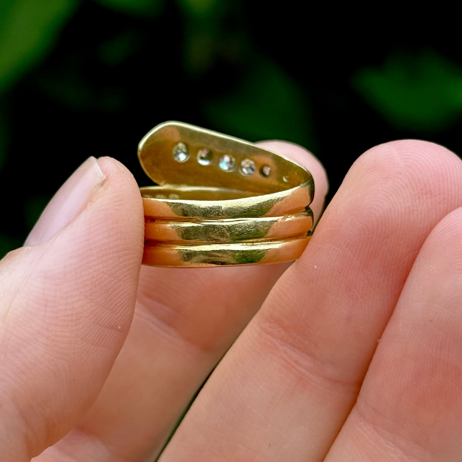 A truly exceptional example of early 20th century jewellery. This magnificent snake ring dates to 1912 and is created from buttery 18 carat gold. Formed in a beautifully tactile coiled design, the ring wraps gracefully around the finger and culminates in a finely modelled snake head. Set into the head are five graduating old cut diamonds, each displaying the soft fire and charm characteristic of their era.