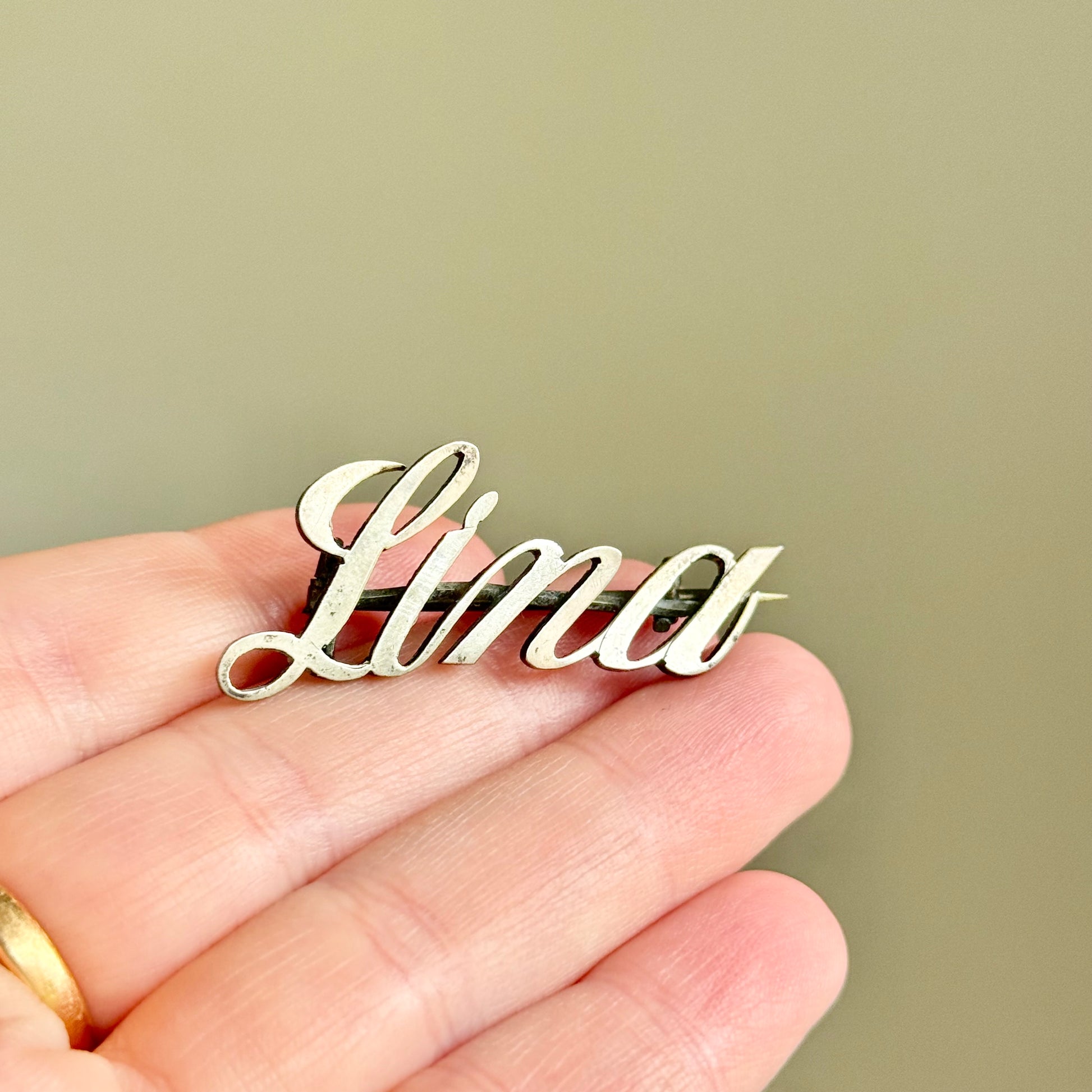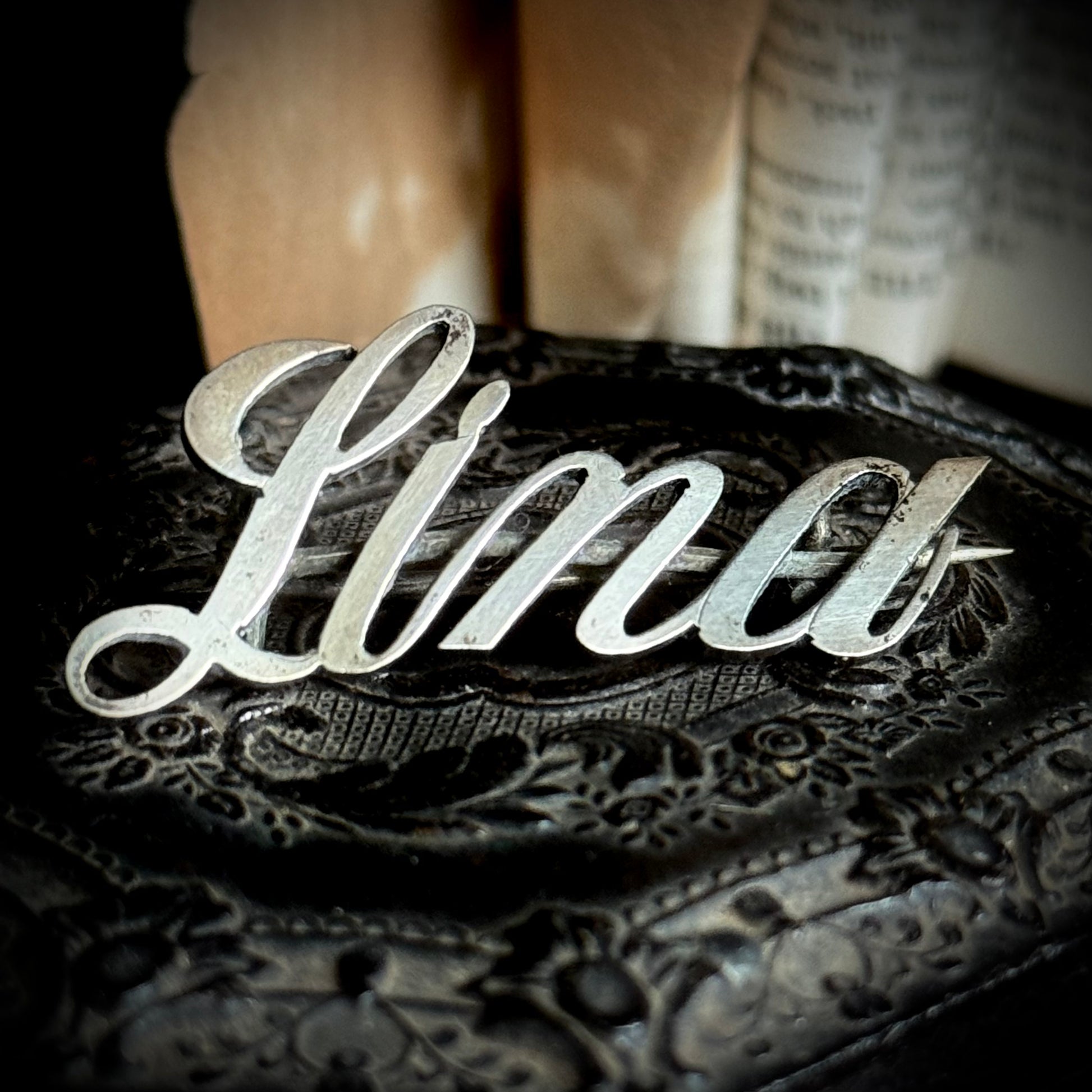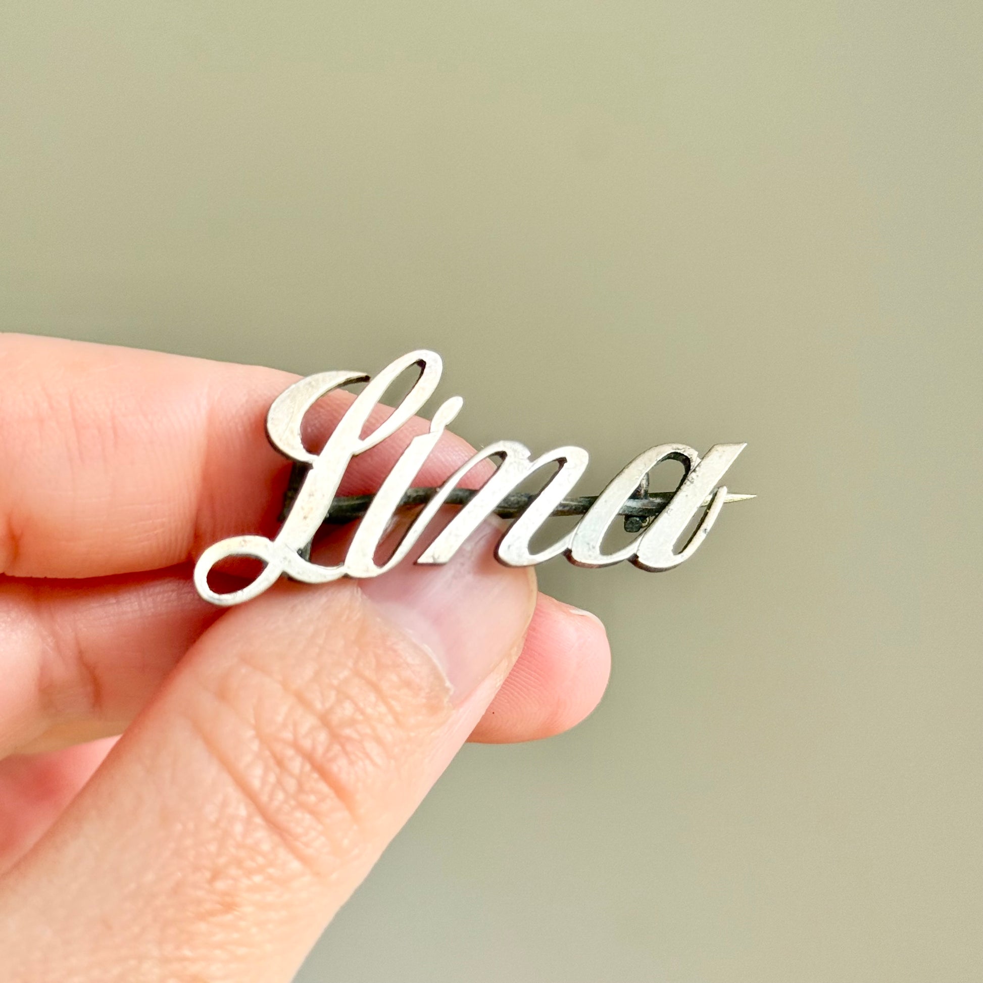 A charming and personal antique name brooch, beautifully crafted in silver and formed in elegant script to spell the name “Lina.”