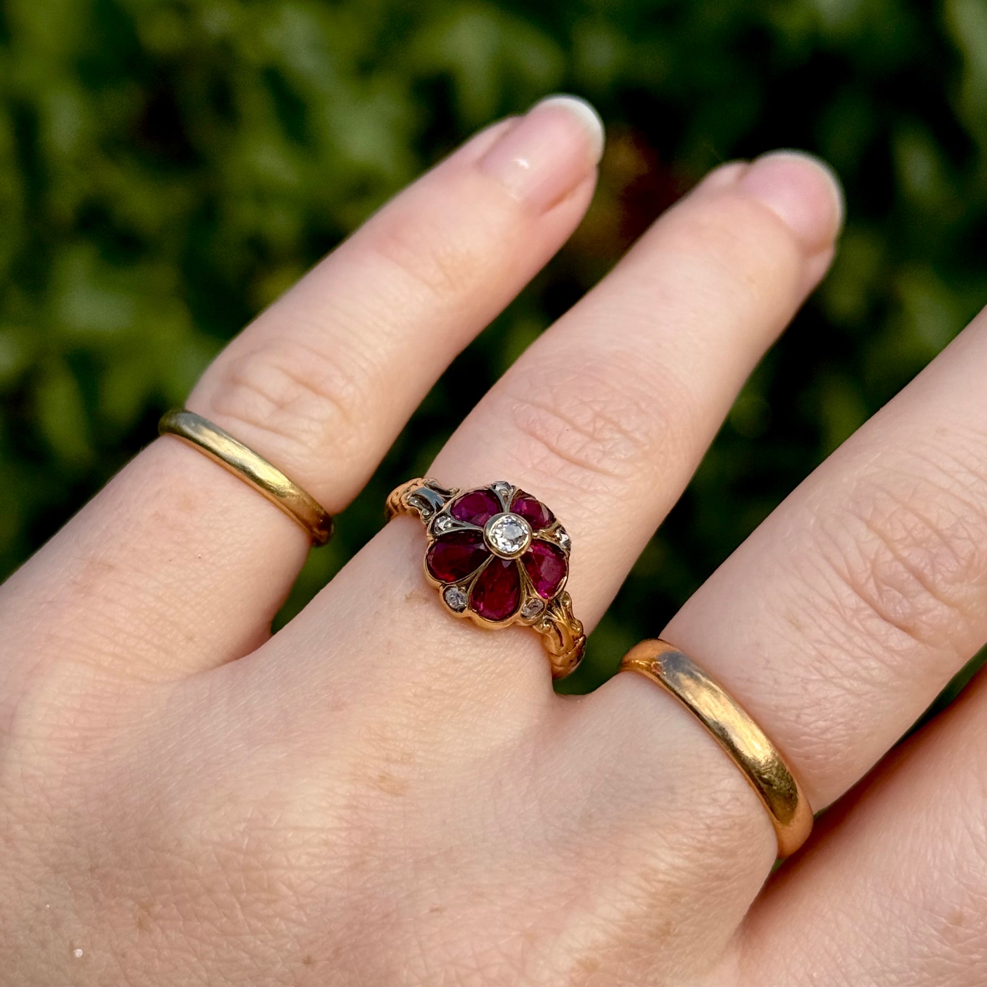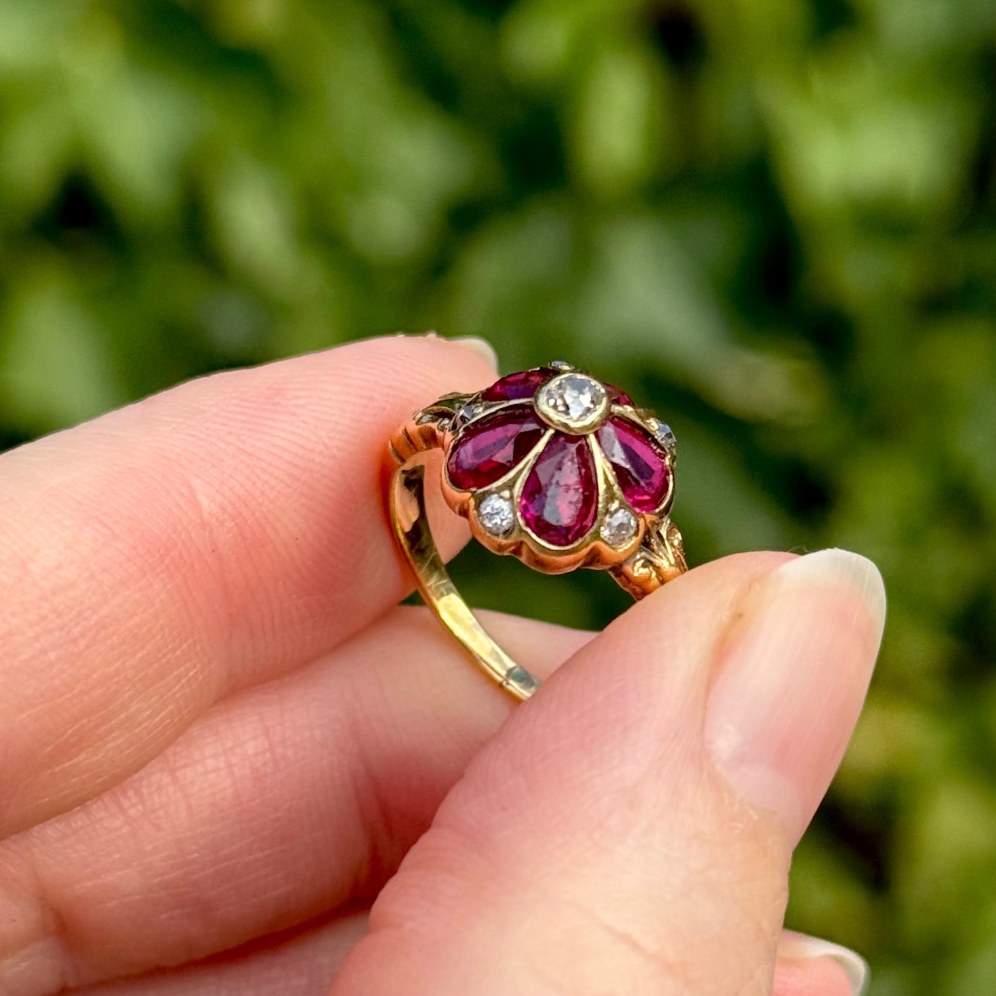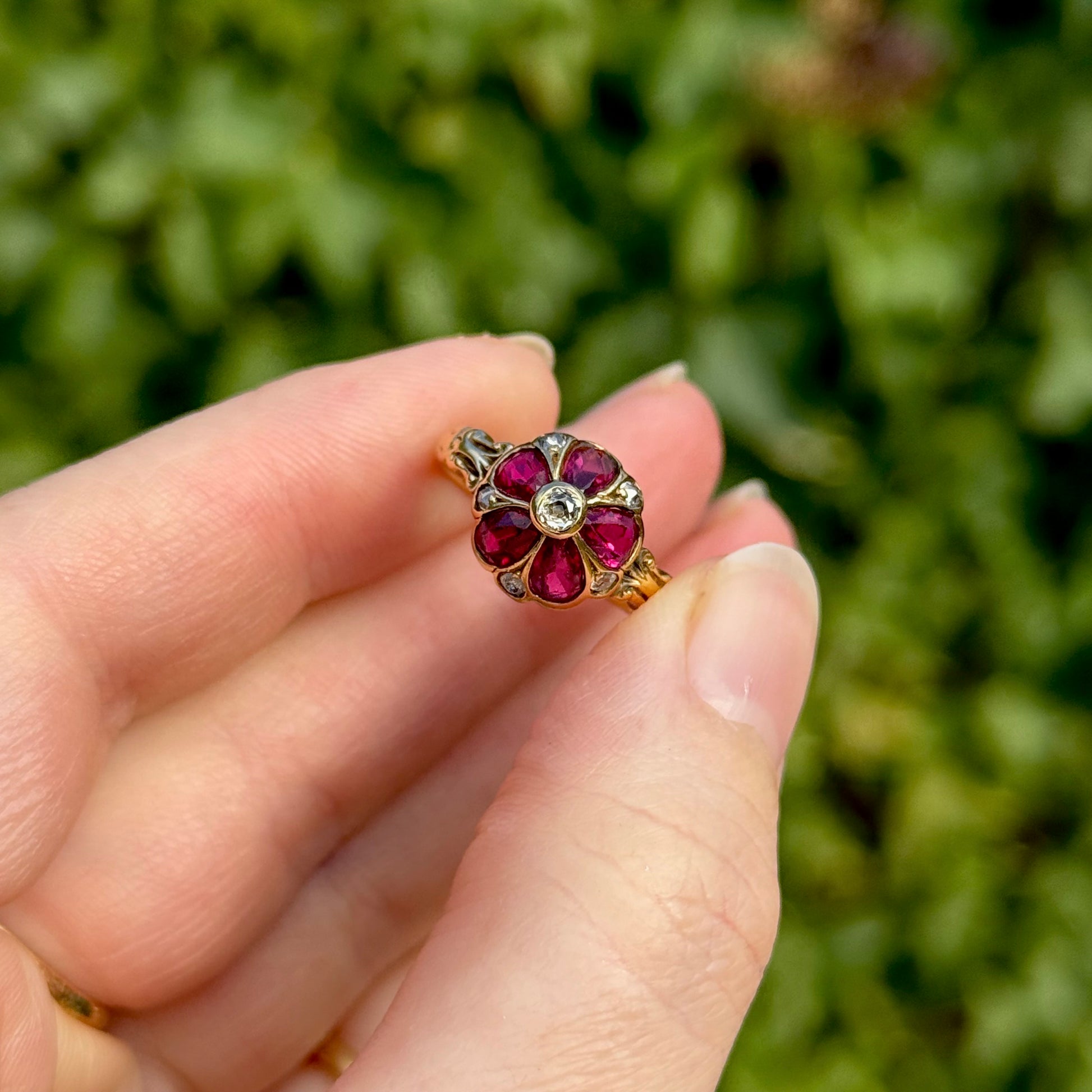 At its heart sits a rich old cut diamond, surrounded by vibrant ruby set petals, each carefully placed to form the delicate shape of a viola in full bloom. Additional old cut diamonds frame the design, adding depth and sparkle. Almost like the morning dew. The setting rises into an elegant, exaggerated dome, giving the ring a wonderfully bold presence on the hand while remaining graceful and balanced.