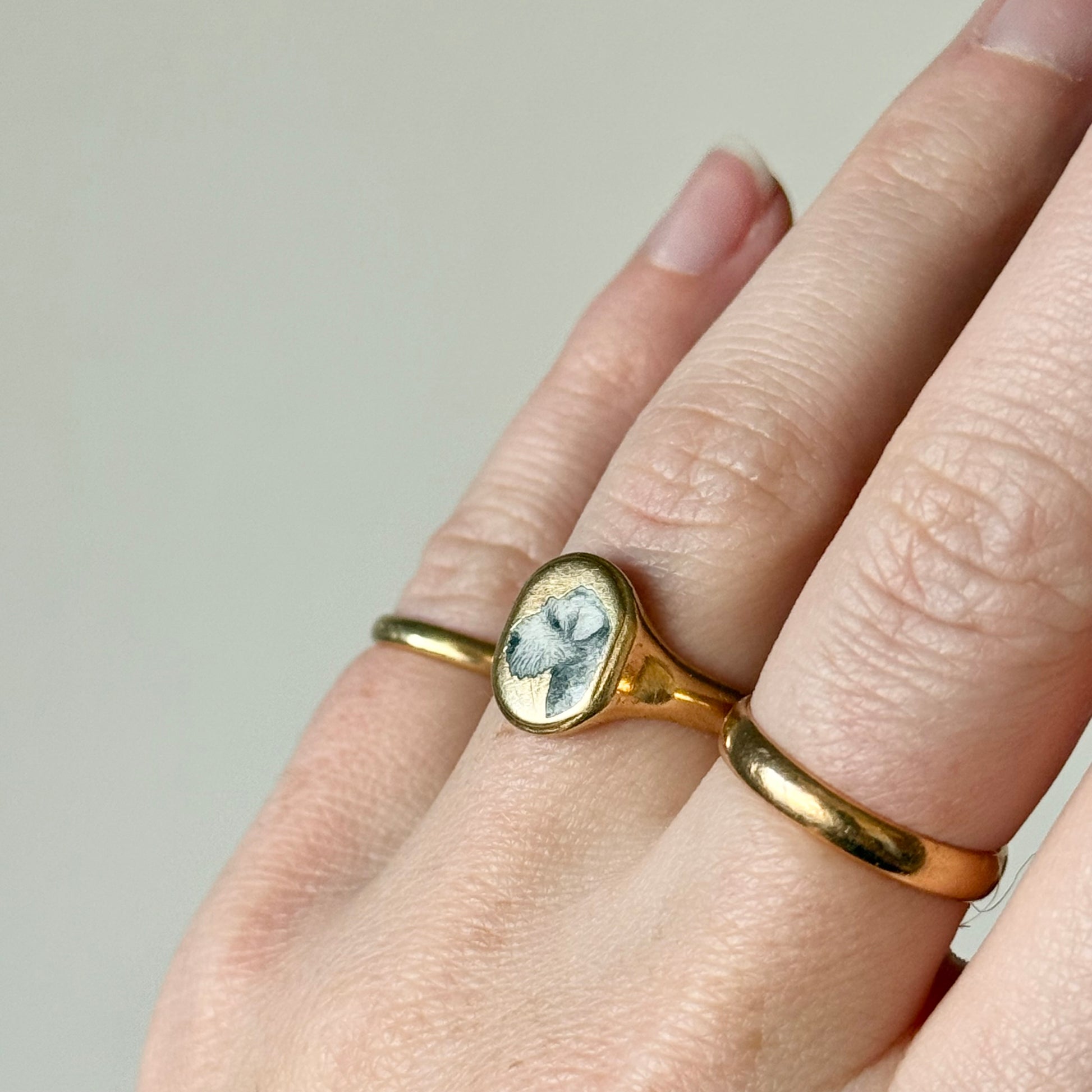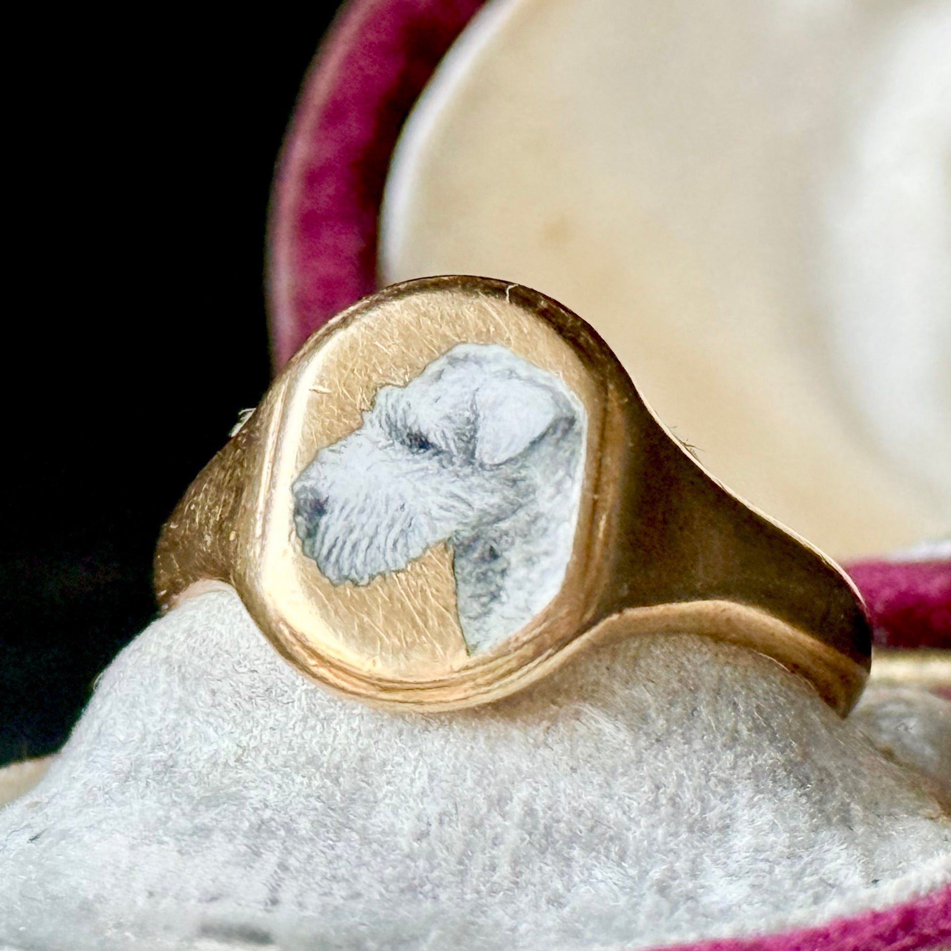 A truly exceptional and rare antique signet ring, created in buttery 18 carat gold and rich in both character and provenance. The ring is boldly designed with a beautifully hand painted enamel portrait of a Wire Fox Terrier, executed with remarkable detail and charm.