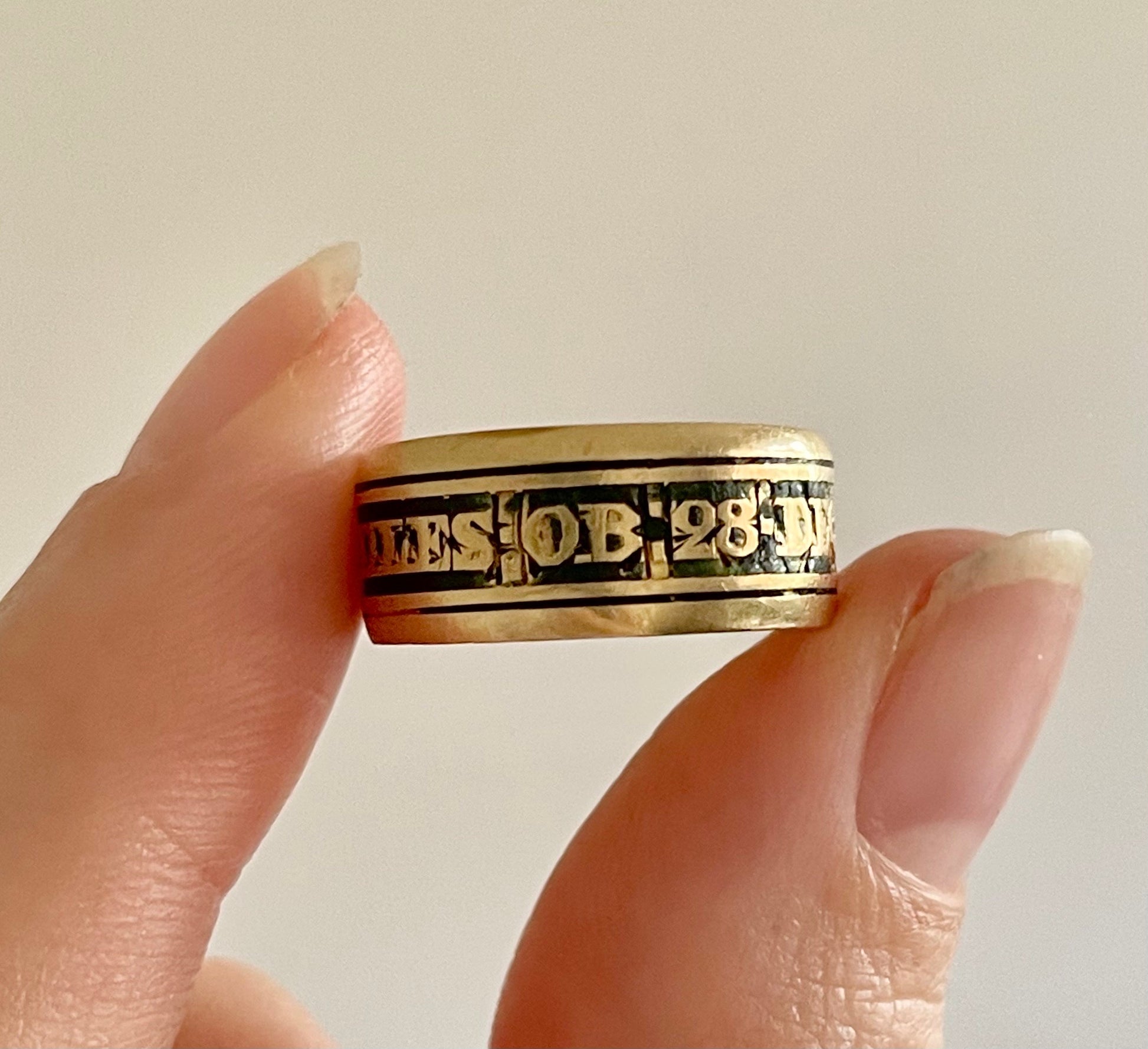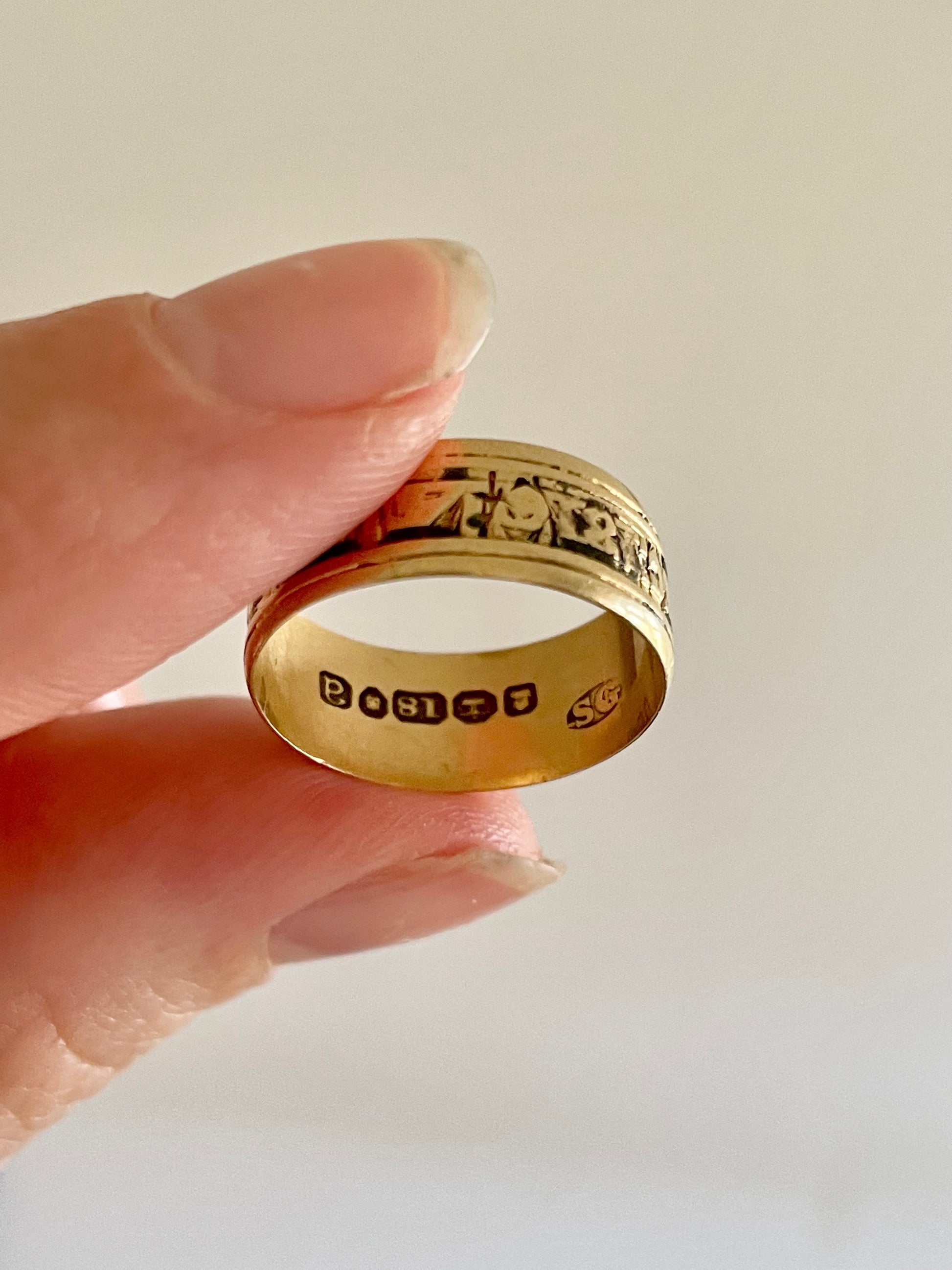 Beautifully handcrafted in 18 carat gold, with a broad band of 7 - 8mm, this ring remains a remarkable piece of Georgian sentiment and craftsmanship. A jewel not only of gold, but of memory, love, and enduring humanity.