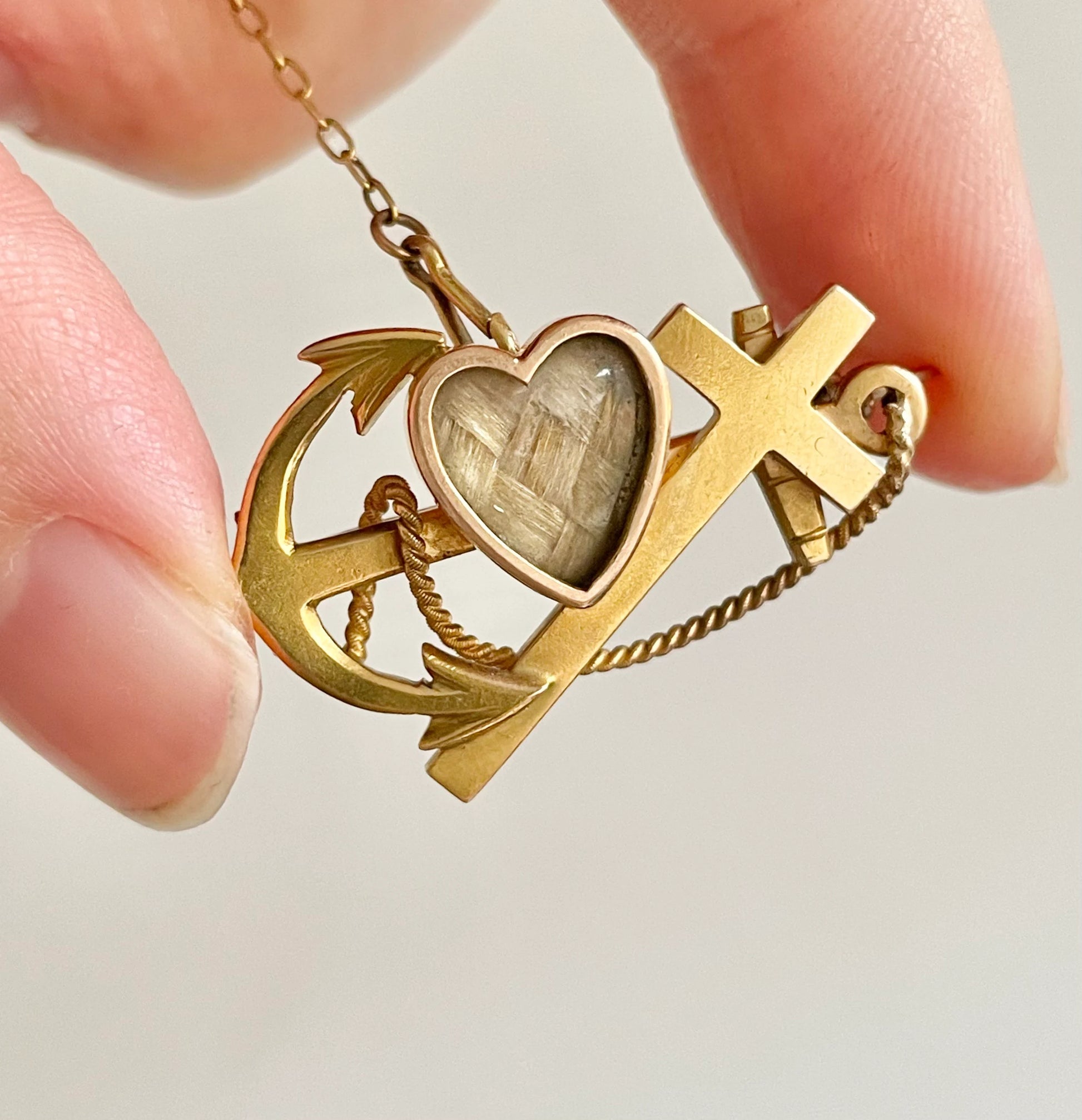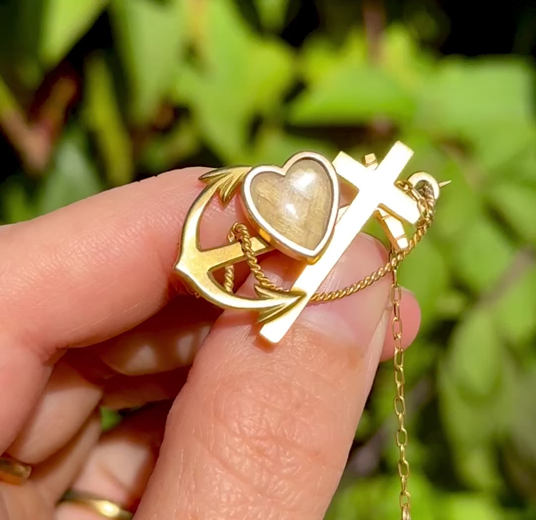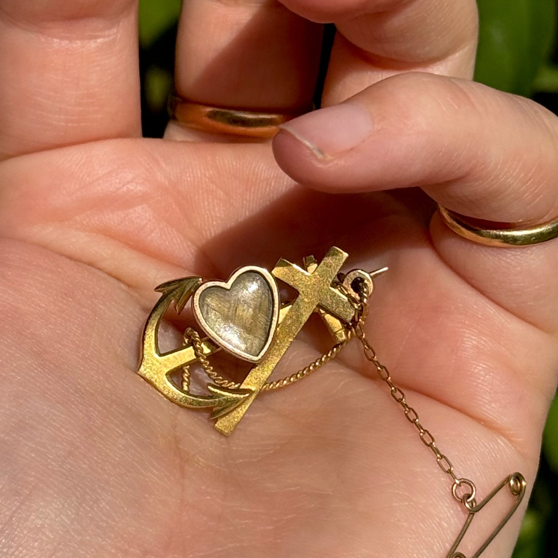 A jewel steeped in sentiment and symbolism. This exquisite Victorian brooch is a tender testament to love and devotion, a piece created not merely to adorn, but to hold meaning. Created in 15 carat yellow gold, it beautifully weaves together the three great virtues of the age: a cross for faith, an anchor for hope, and a heart for charity.