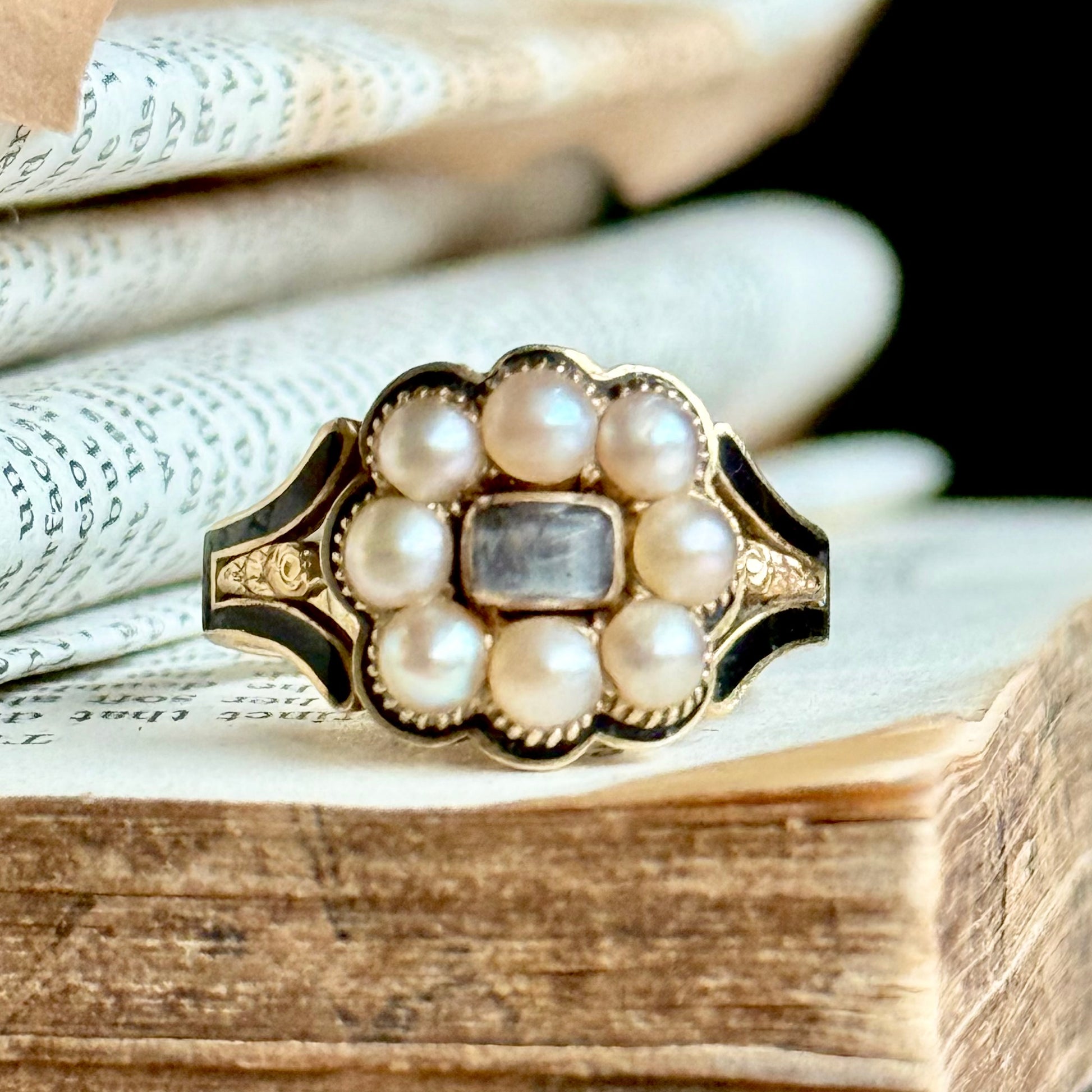 A rare and profoundly sentimental jewel from the Georgian era. This exquisite mourning ring holds not just beauty, but deep personal history. Created in high carat gold, the ring features ornate black enamel detailing along the shoulders and setting. The rich enamelwork intertwining with fine gold engraving, as was traditional in mourning jewels of the early 19th century.