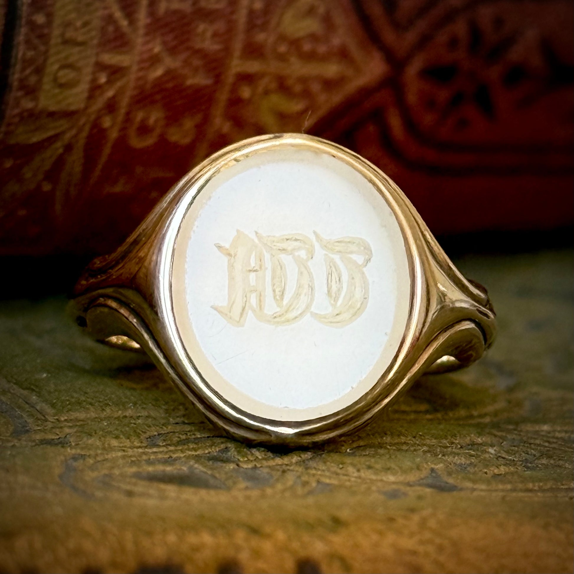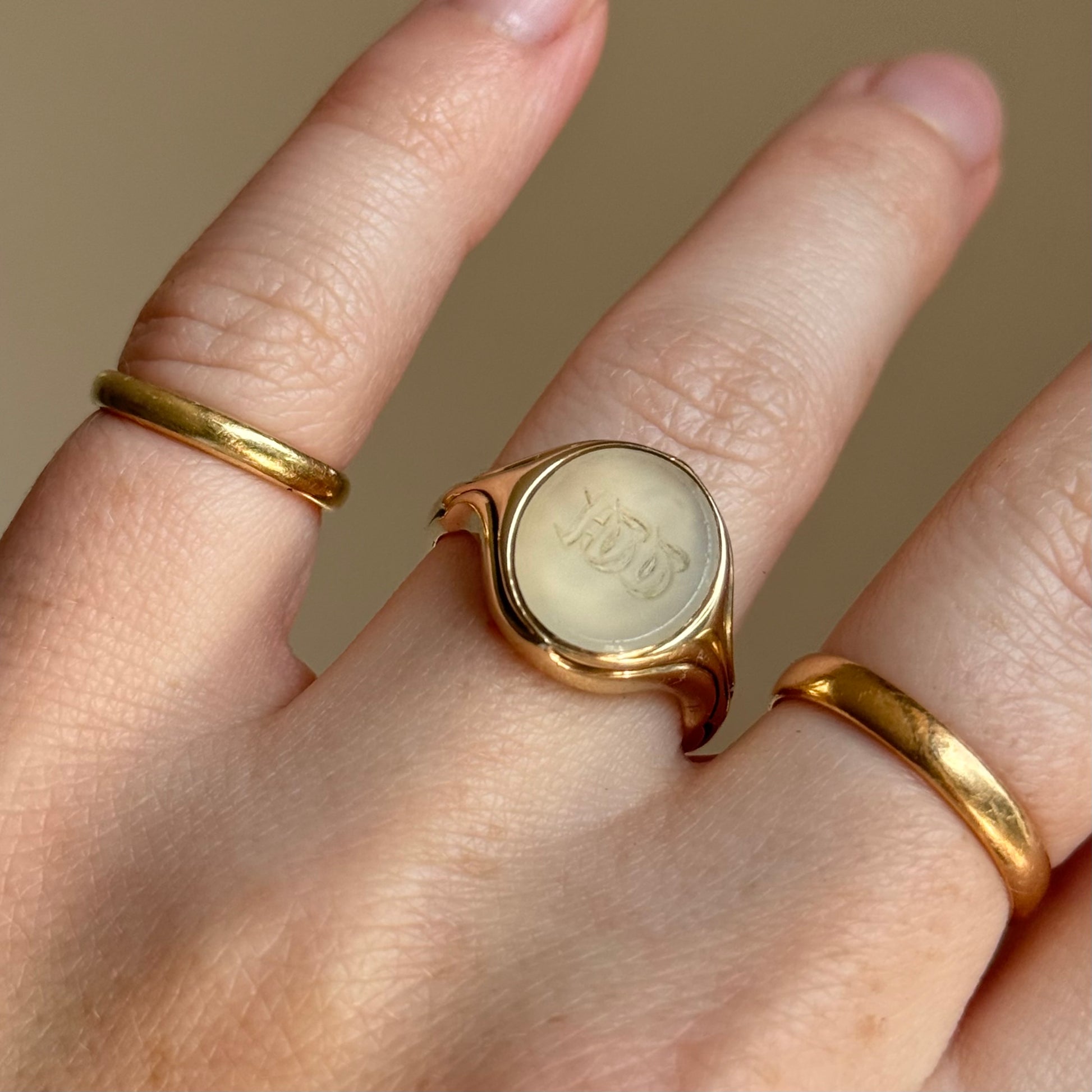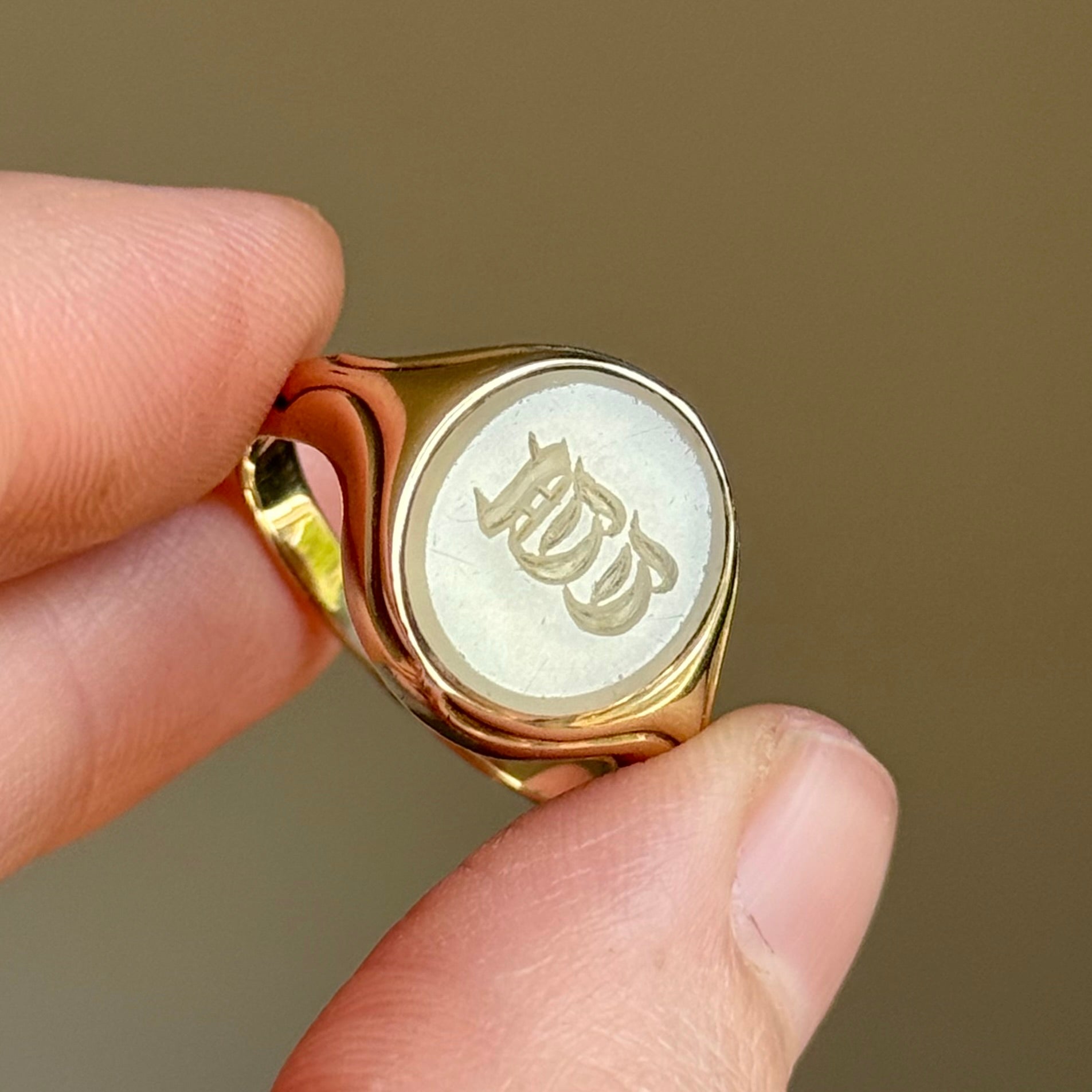 Designed in the classic mid 1800's style, the ring is set with a luminous chalcedony panel, its soft, milky translucence giving the surface a gentle glow. Engraved in Gothic script are the initial “W,” crisply cut within the smooth stone.