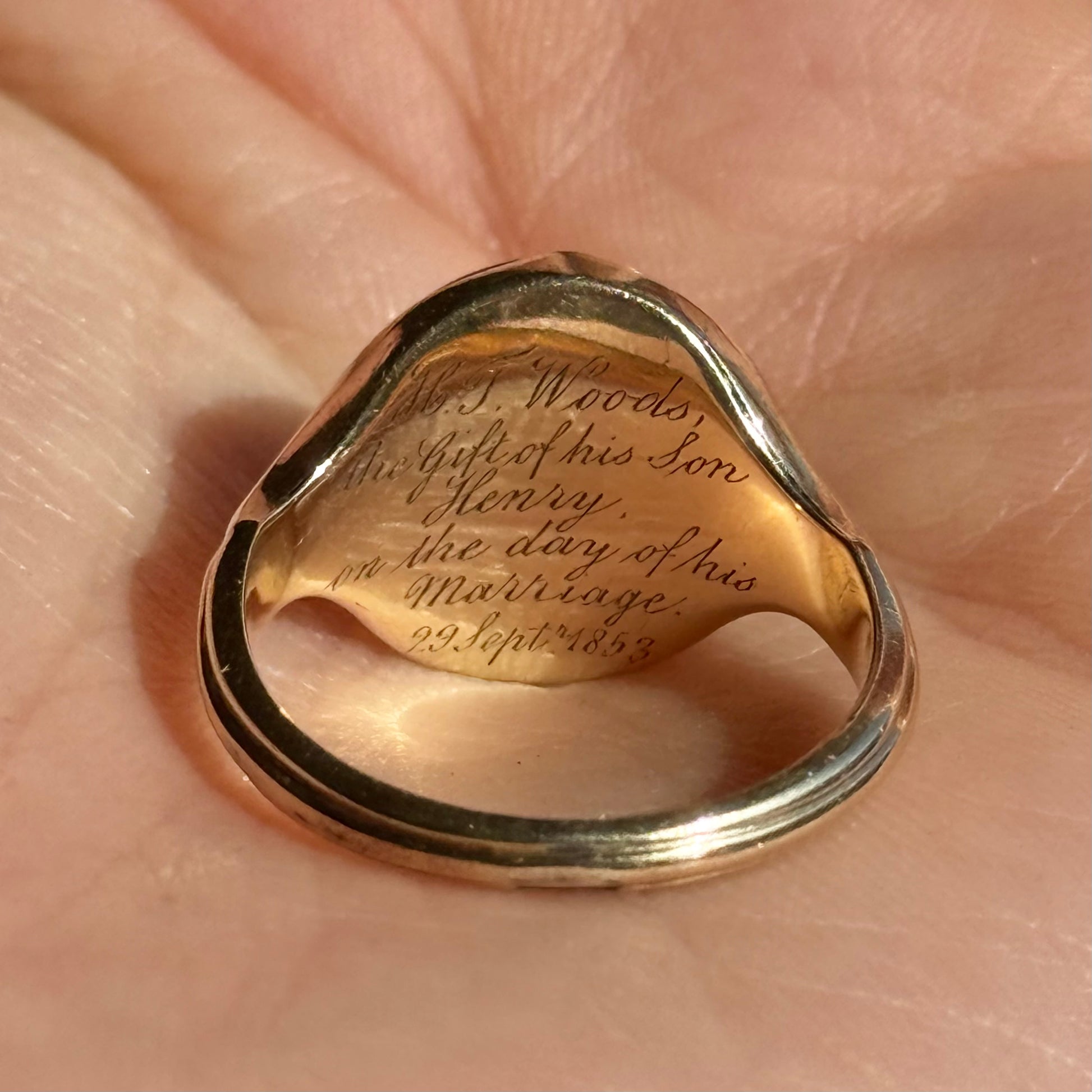 What truly sets this ring apart, however, is the extraordinary inscription hidden within the back of the signet Carefully engraved inside are the words: “H. J. Woods the gift of his son Henry, on the day of his marriage 29 Sept. 1853.”