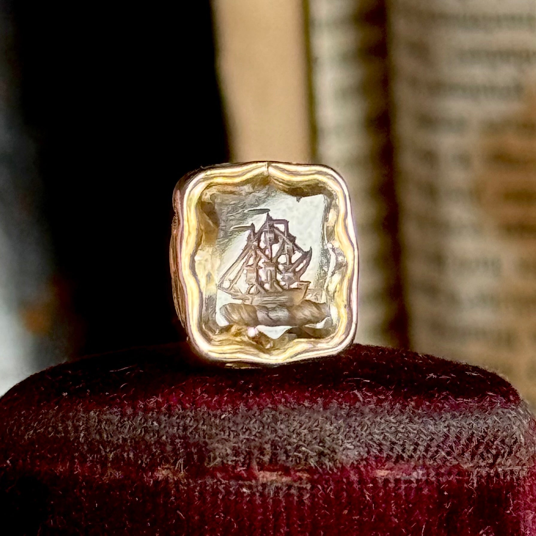 This evocative piece is finished with a hand carved citrine intaglio, its warm golden hue lending depth and glow to the finely detailed image of a rigged sailing vessel. The carving is beautifully executed, with crisp lines and gentle translucency that allow the light to bring the ship to life as it moves across the stone’s surface.