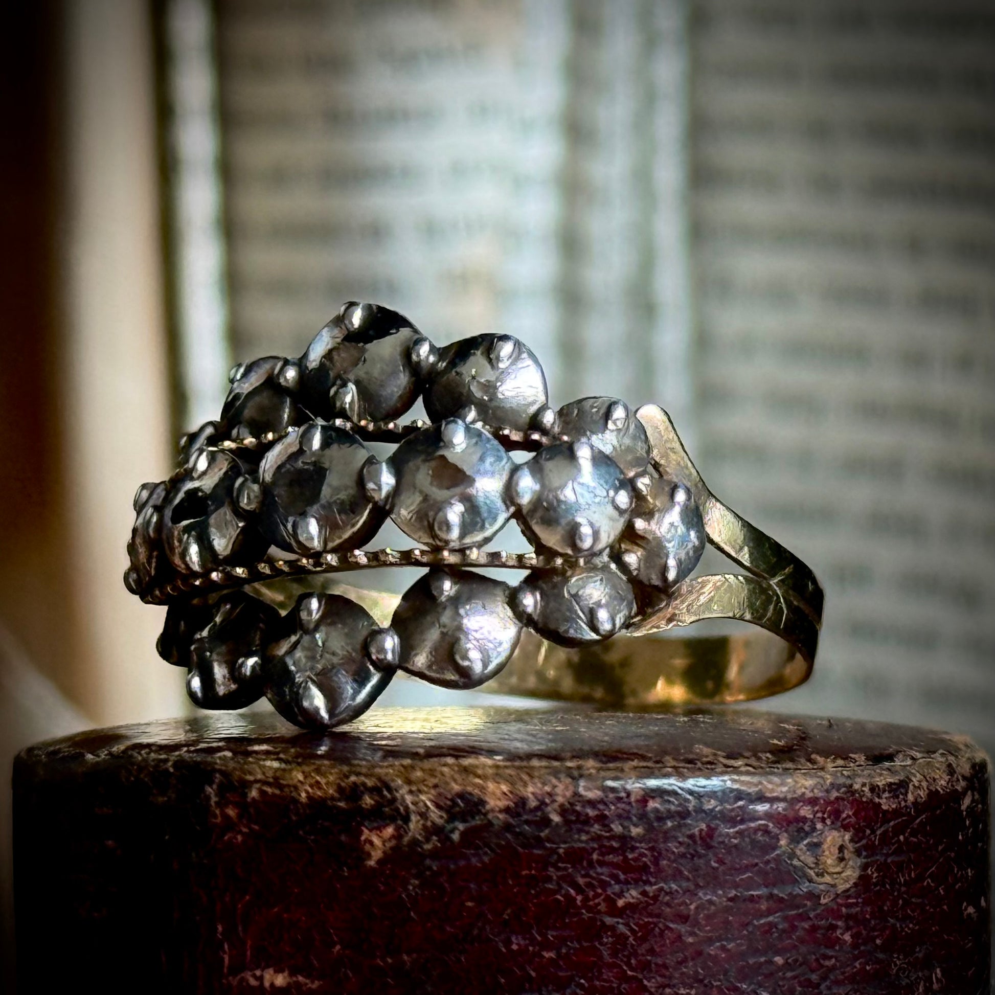 This elegant antique ring is designed with three graduating rows of rose-cut diamonds, each delicately set within silver collet settings. The diamonds themselves are petite, as was typical of the period, but the clever use of collets enhances their presence, allowing them to catch and reflect light beautifully. In candlelight, how this ring would originally have been admired, the stones shimmer with a soft, romantic sparkle that is utterly characteristic of Georgian jewellery.
