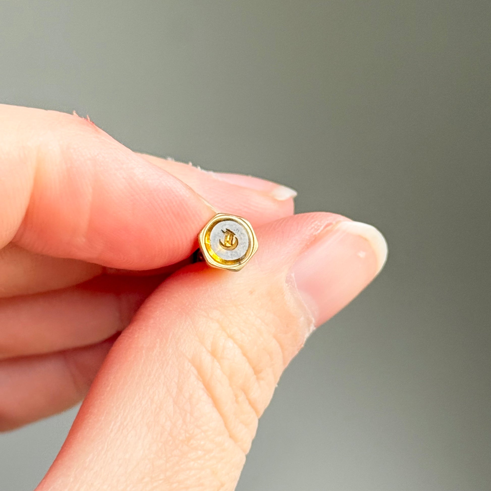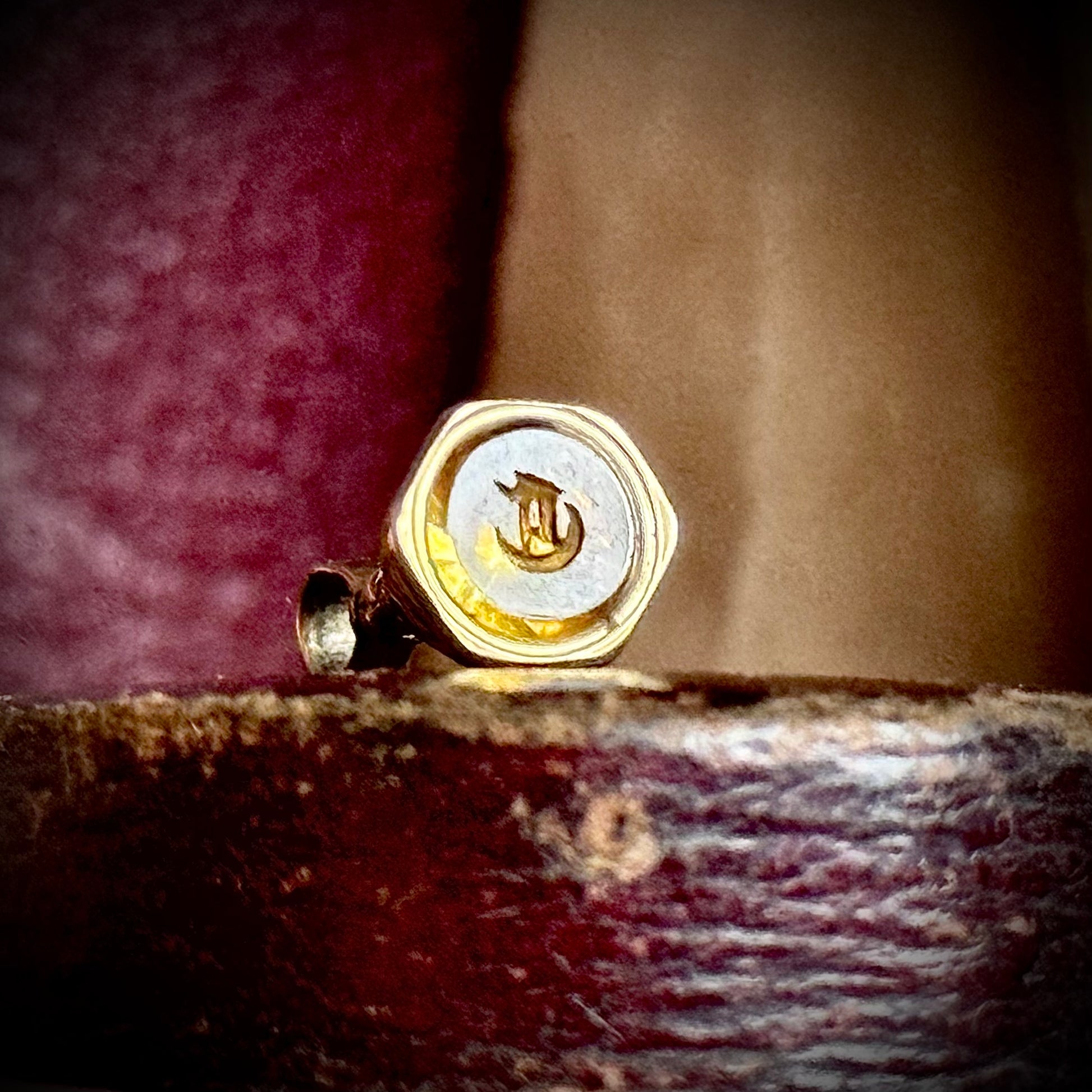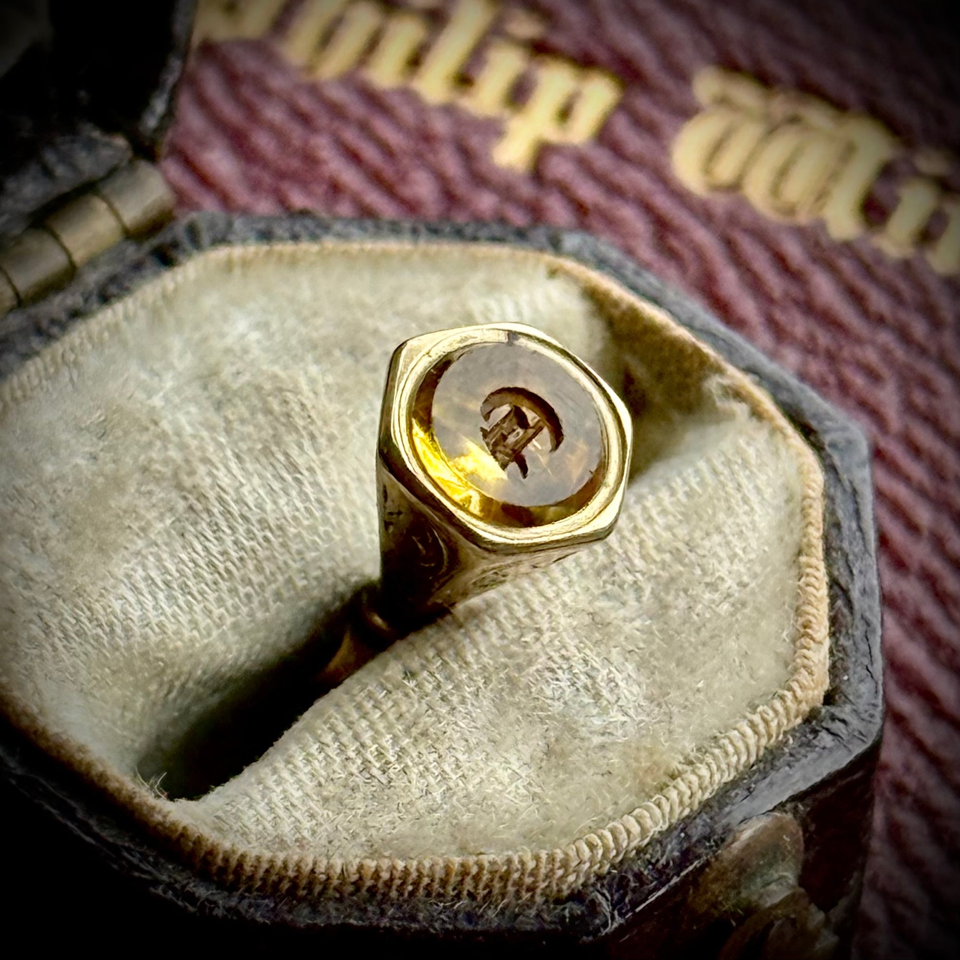 The golden tones of the 9 carat gold frame perfectly complement the warmth of the yellow glass, creating a subtle harmony of colour and light. Around the base runs subtle ornate engraving, a testament to the skill and artistry of the era. Even the smallest of objects were made with care and meaning.