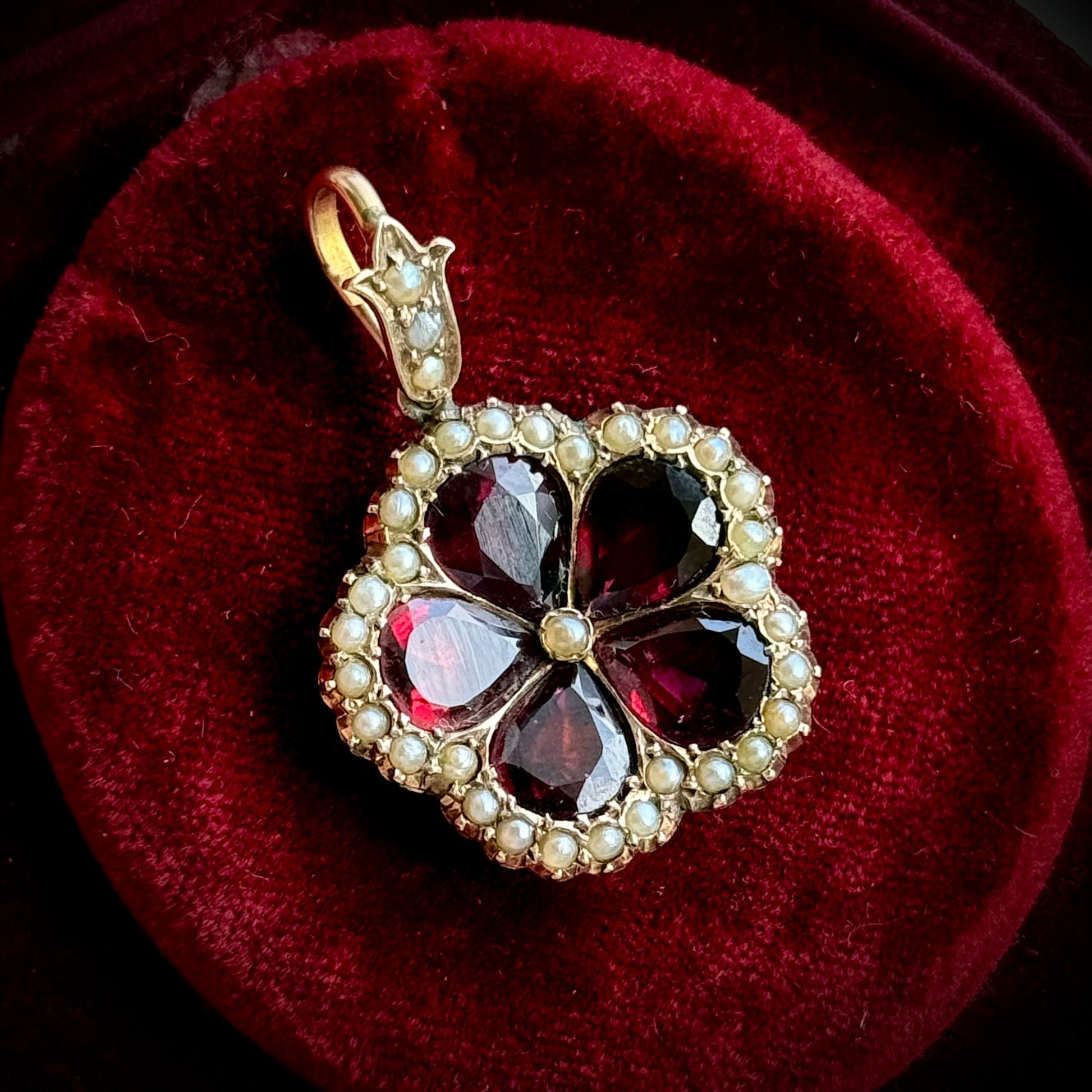 CONDITION: The pendant is in lovely antique condition with a fine patina across the surface of the garnets and pearls.