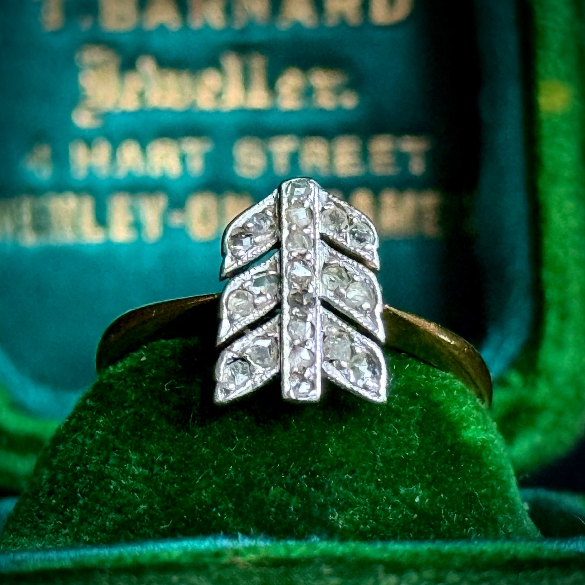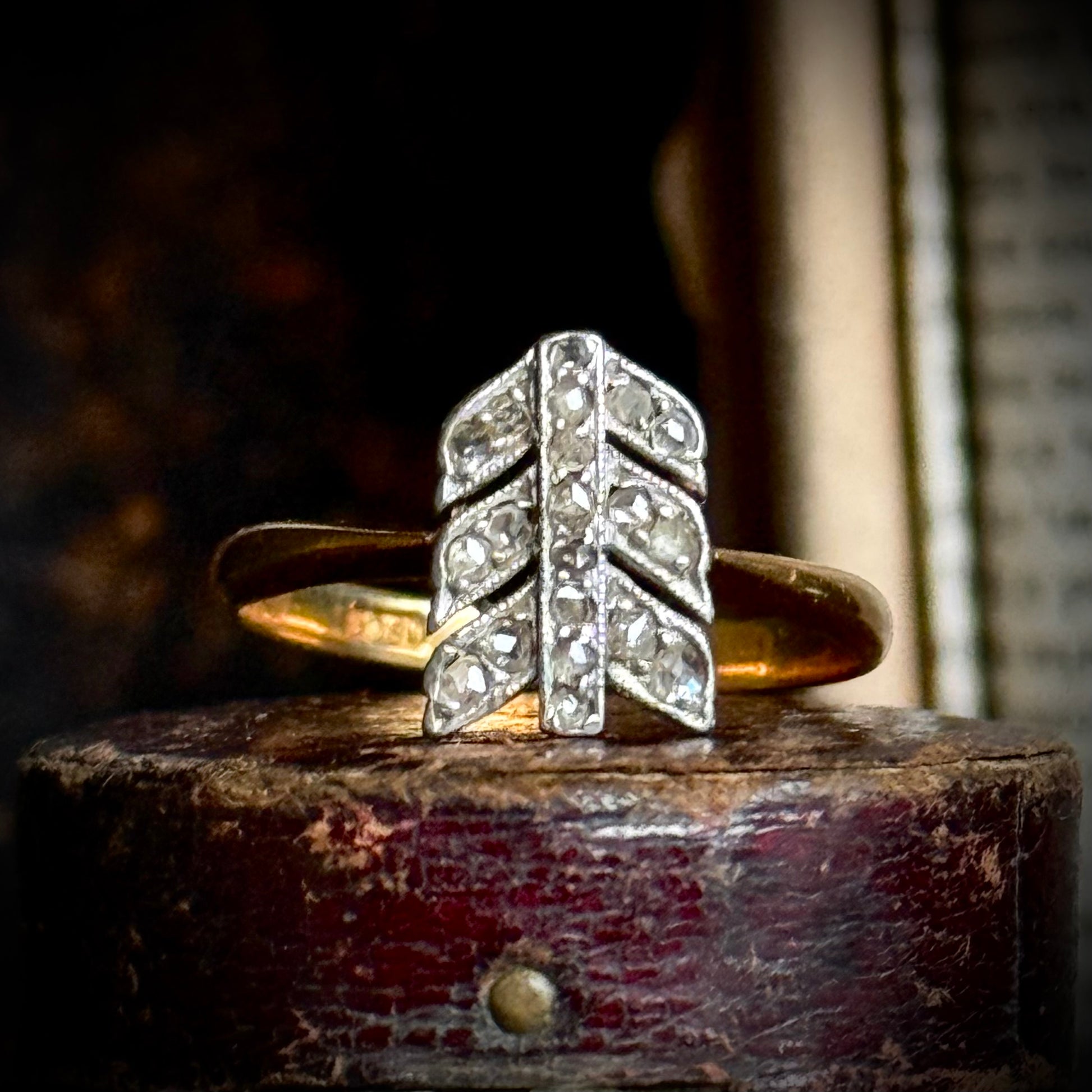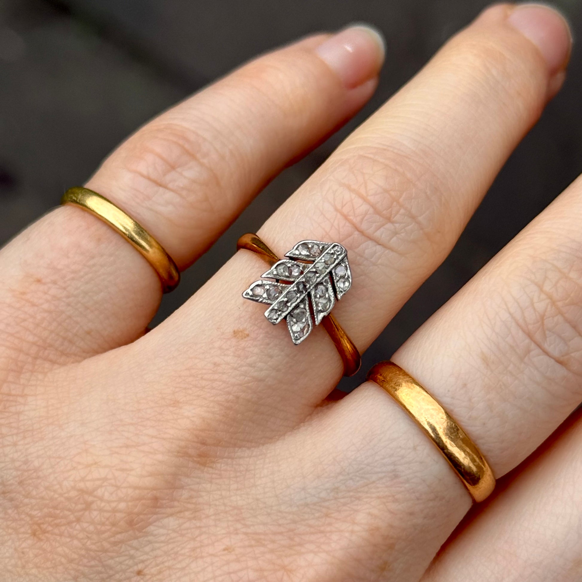 A truly darling antique ring, rich in symbolism and historic charm. The design is centred around the feathered fletching end of an arrow; a powerful motif in antique jewellery, traditionally associated with direction and love’s true aim.