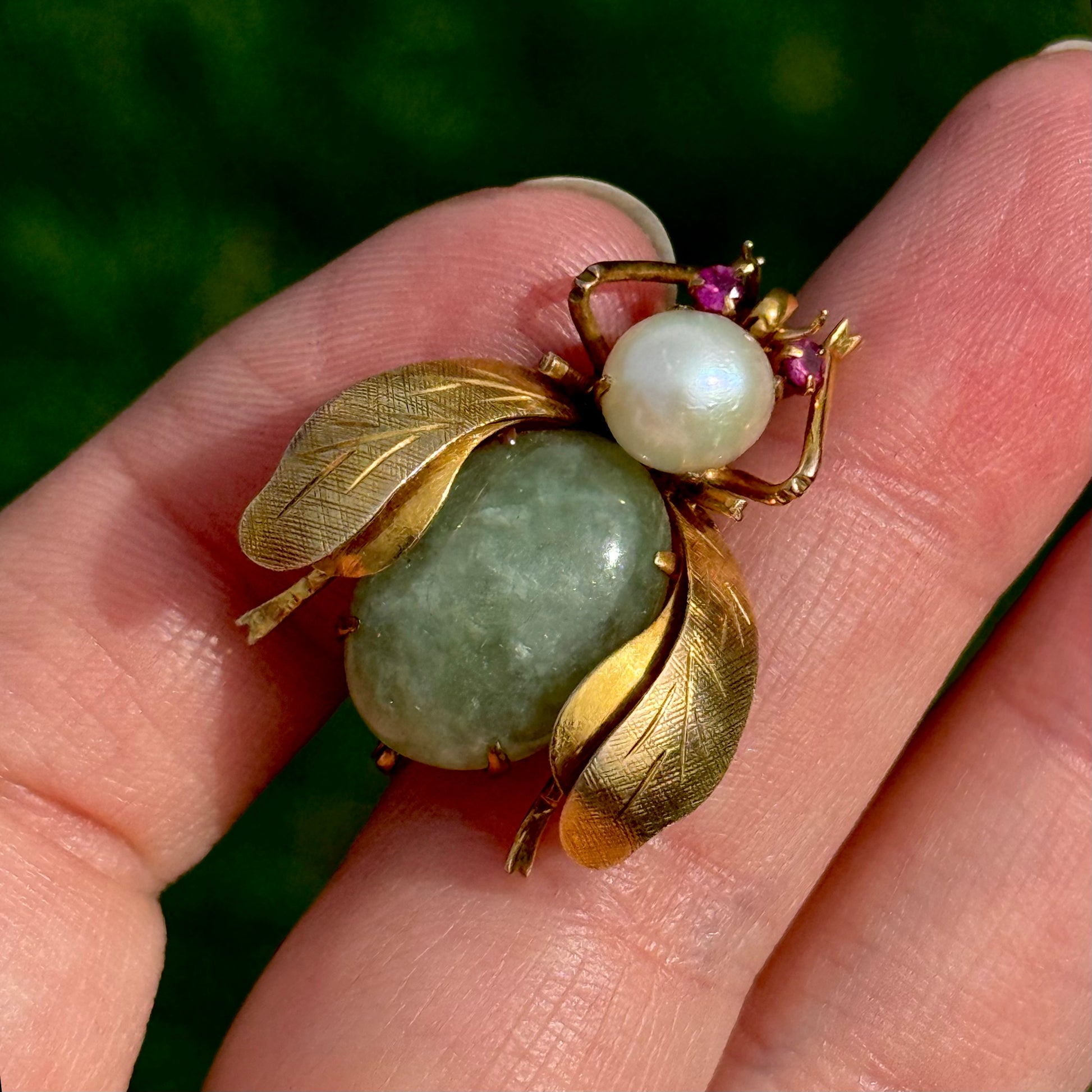 The bee is highly detailed, with a large moss green jade stone forming the main body, paired with a lustrous pearl that adds softness and contrast. Together the stones create a lovely sense of movement and natural form. Adding a vibrant touch of colour, the bee’s eyes are set with two raspberry hued rubies, giving the piece a lively and expressive character.