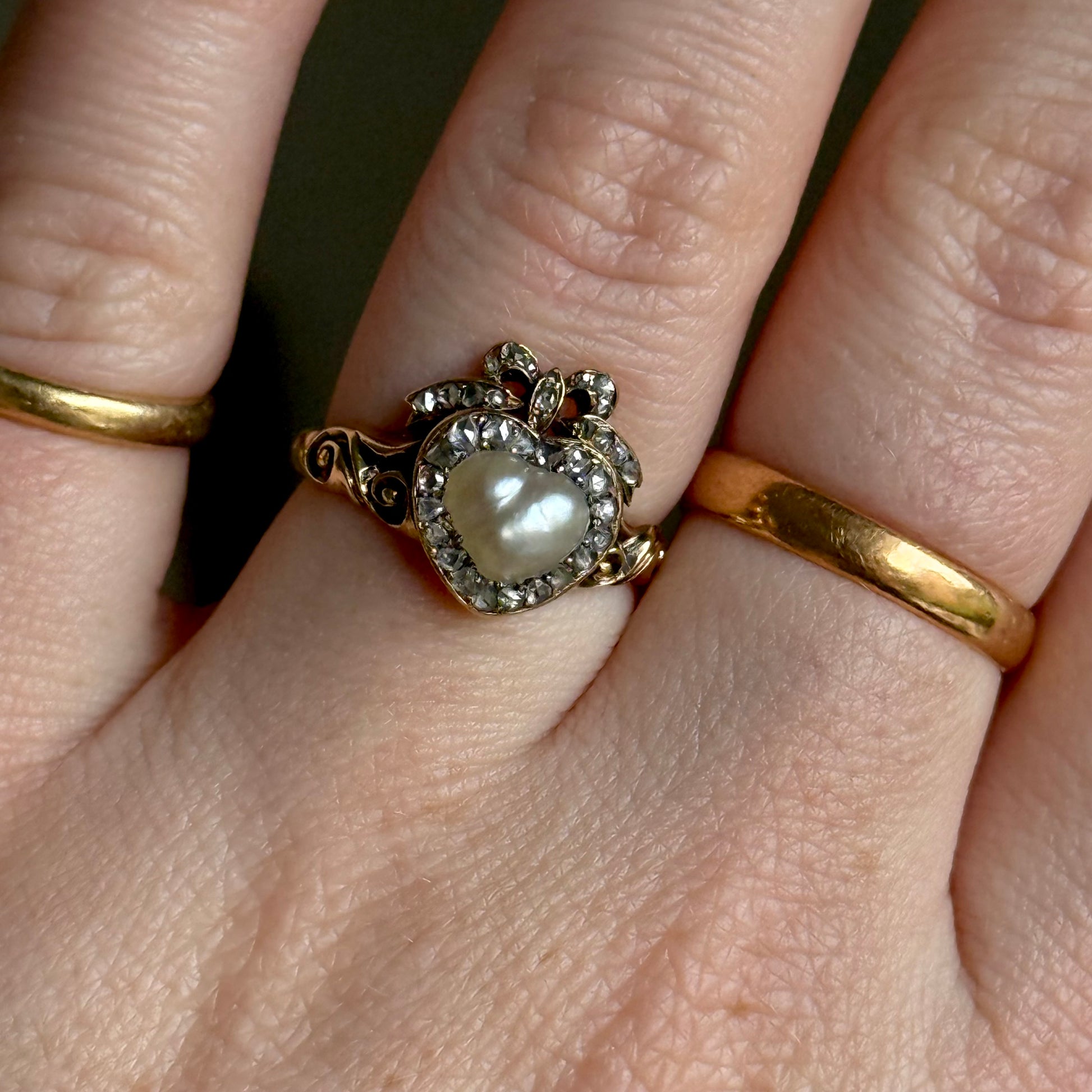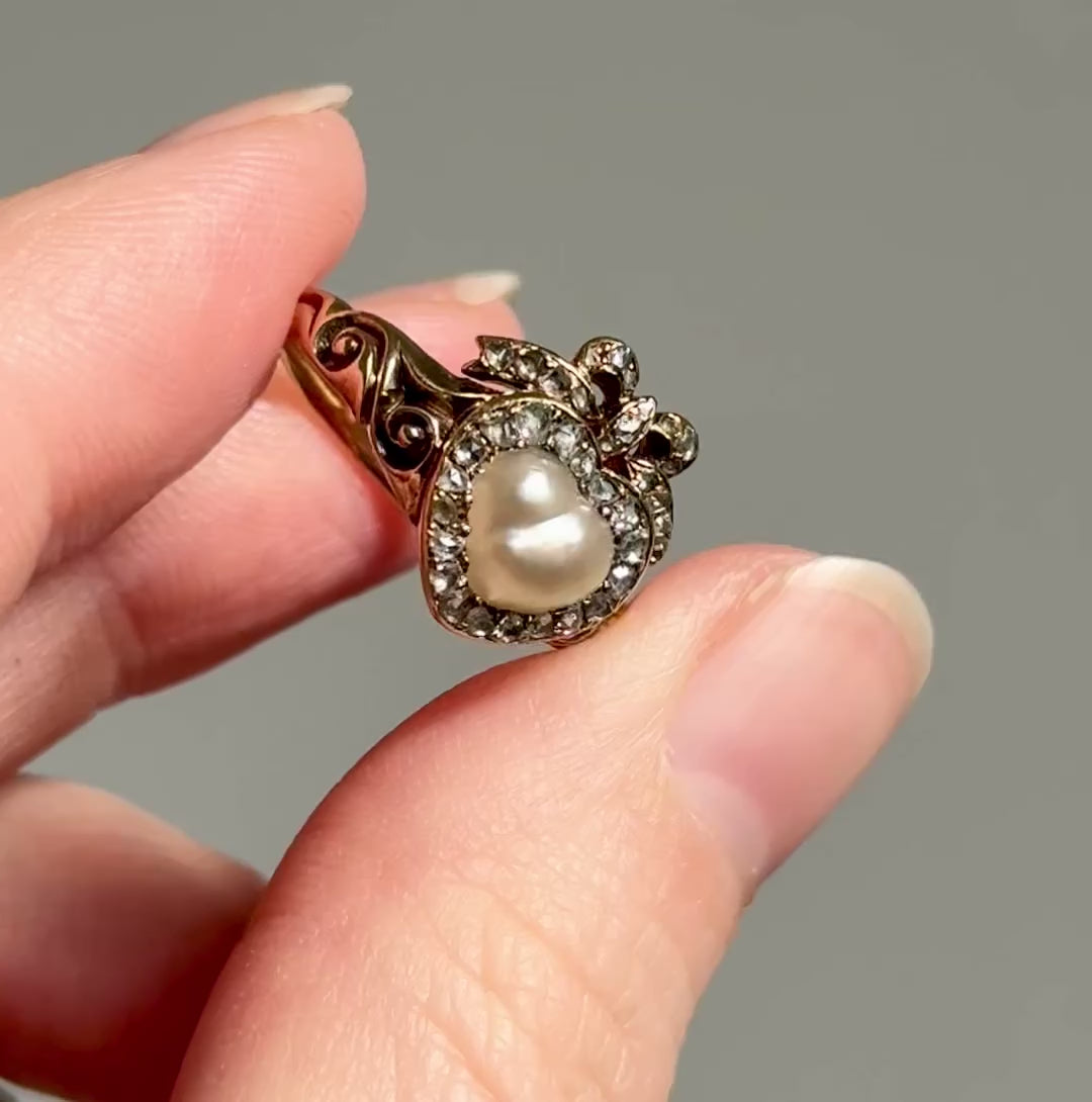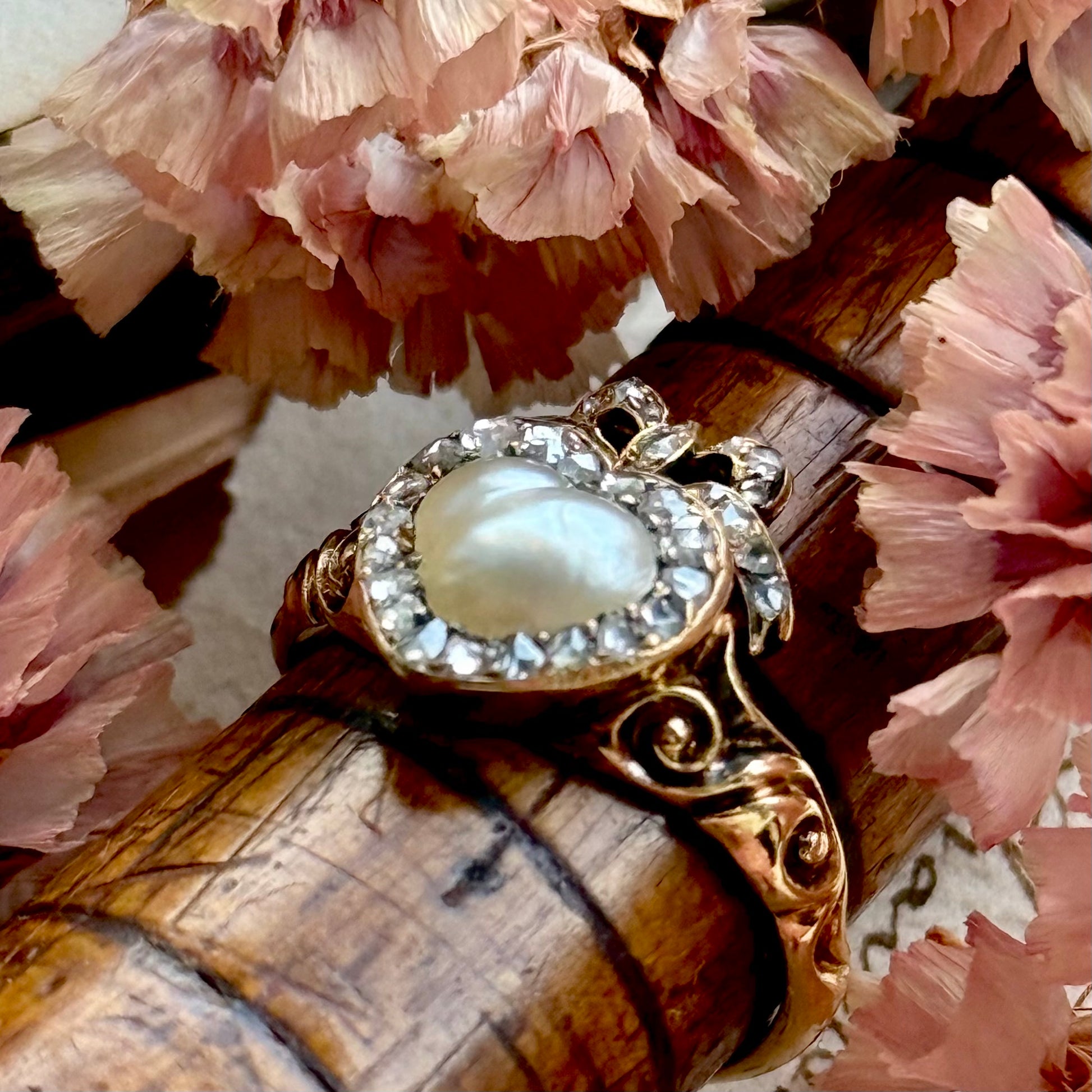 Antique Boxed Georgian Pearl & Diamond Ring in 18 Carat Gold; Circa 1800