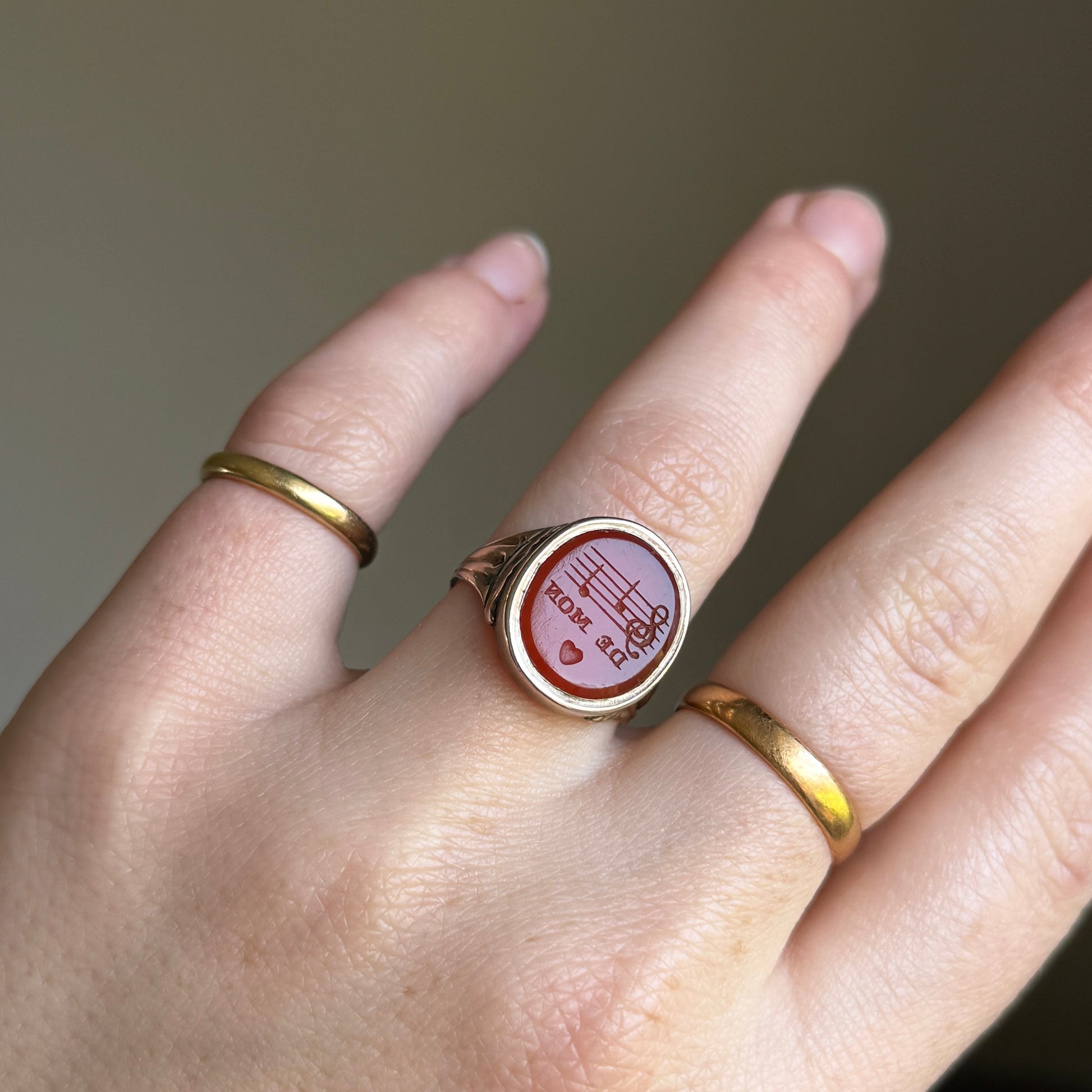 The carnelian has been intricately carved with a rebus puzzle. A playful and sentimental form of visual wordplay that was particularly popular in the Georgian period. The design features a bar of musical notation, followed by the words “De Mon”, and a love heart beneath. When read together, these elements form the poetic phrase “Music of my heart.”