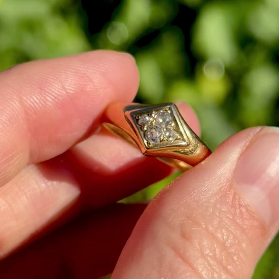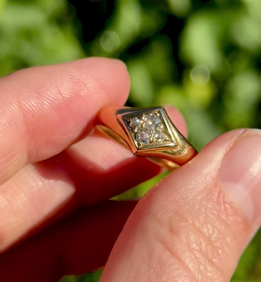 An enchanting jewel. This striking Victorian ring is created as a broad, weighty band of warm gold, its form bold yet beautifully balanced. At the centre sits a sculptural arrangement of four old cut diamonds with two larger and two smaller. A design set in a way that creates a pleasing symmetry. The effect is architectural, giving the ring an almost ecclesiastical presence, as though inspired by the geometry of stained glass or medieval metalwork.
