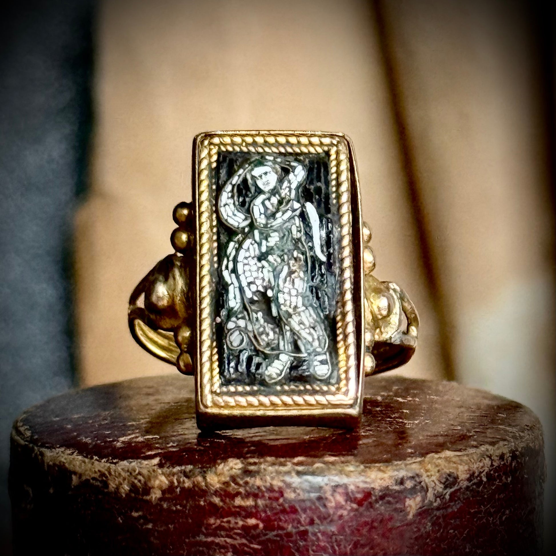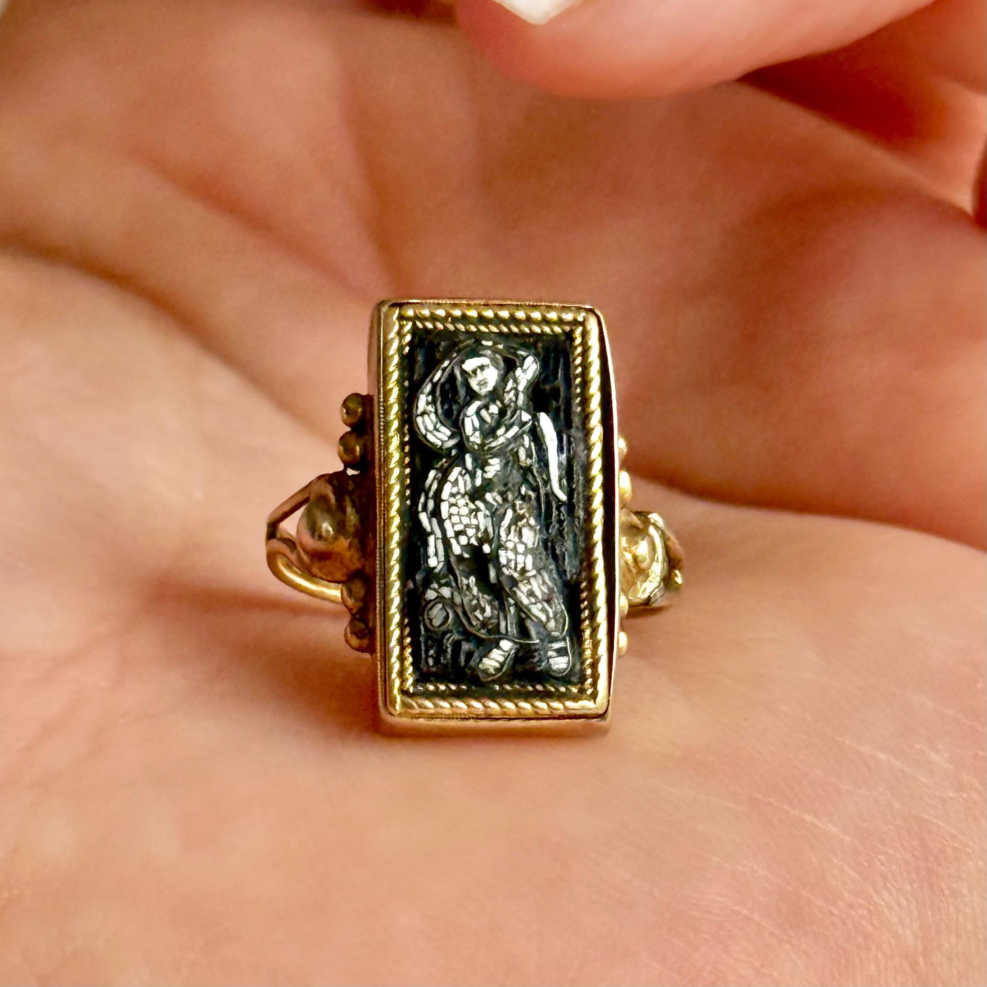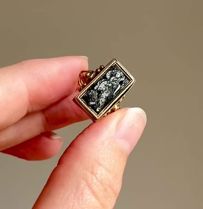 A evocative jewel from the early Victorian era, this exquisite ring captures the artistry of a bygone age. Created in 9 carat gold, its delicate filigree shoulders frame a rectangular panel of micro mosaic work. A painstakingly composed image formed from tiny tesserae. Within the panel, rendered in elegant monochrome tones, is the serene figure of a classical woman; a subject beloved in 19th century.