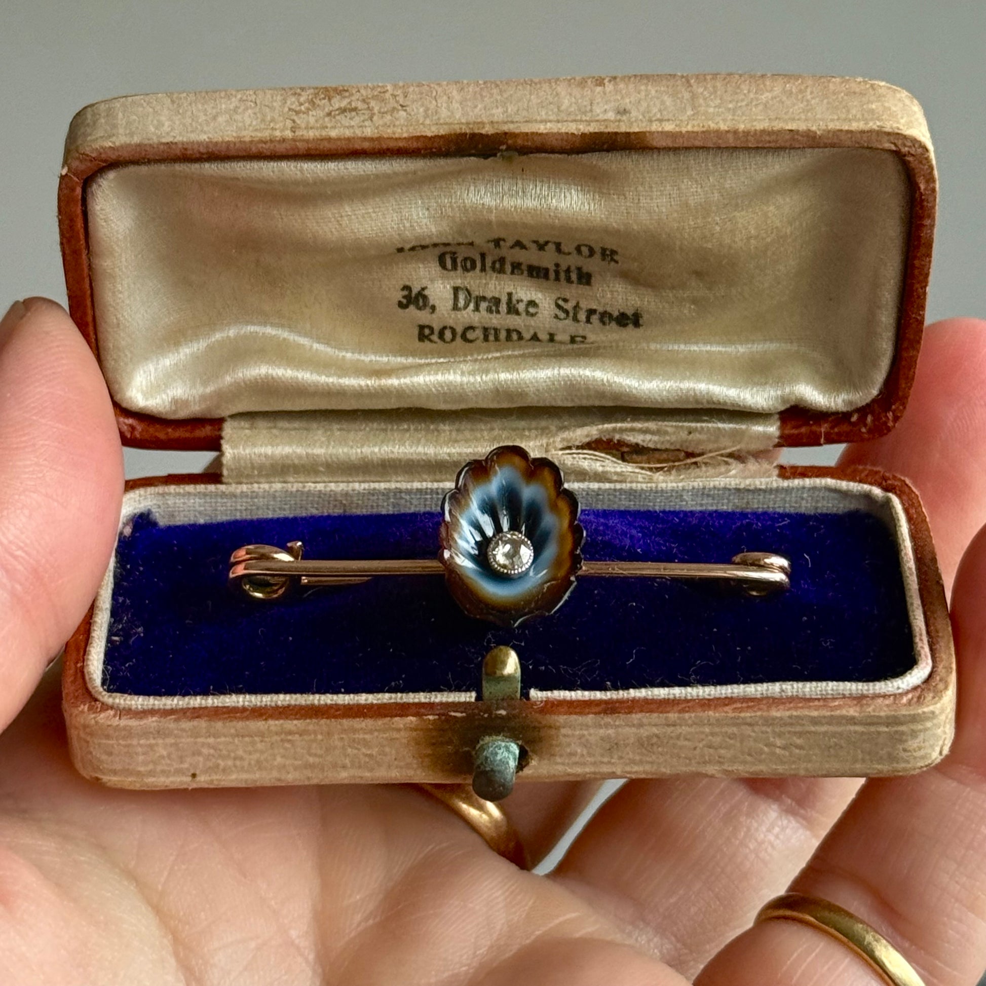 Antique Victorian Agate Shell & Diamond Brooch in 9 Carat Gold.