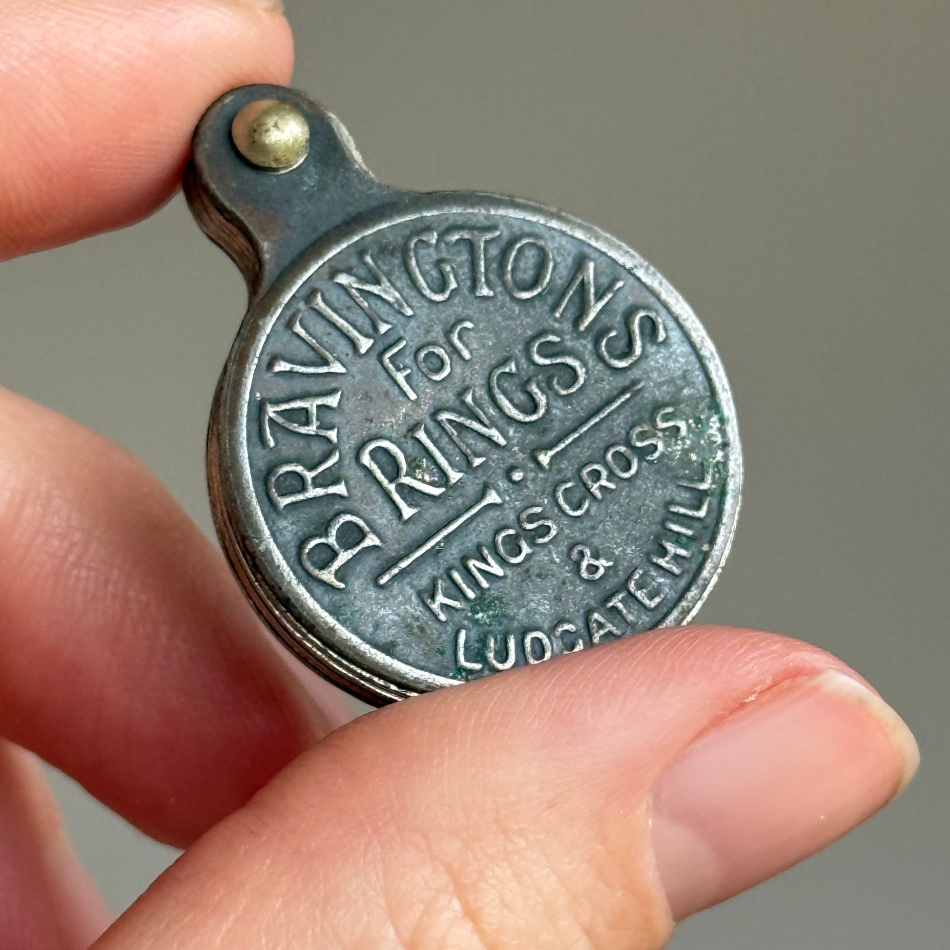This pocket-sized jeweller’s tool features a compact metal case stamped with the Bravingtons name and address: “Bravingtons For Rings – King’s Cross & Ludgate Hill.”