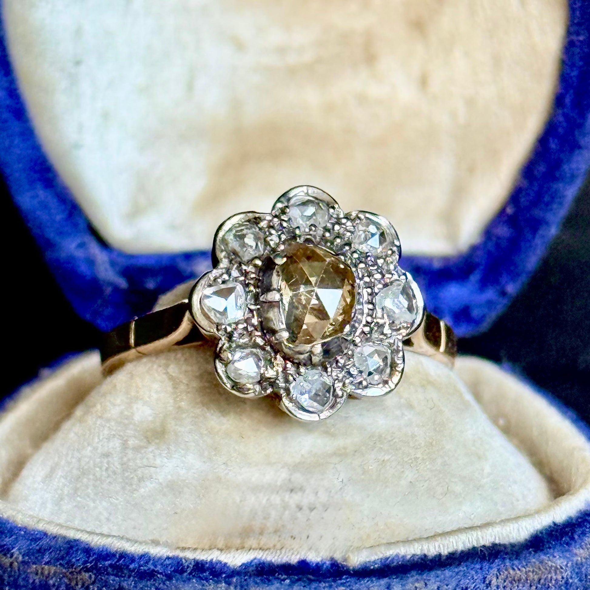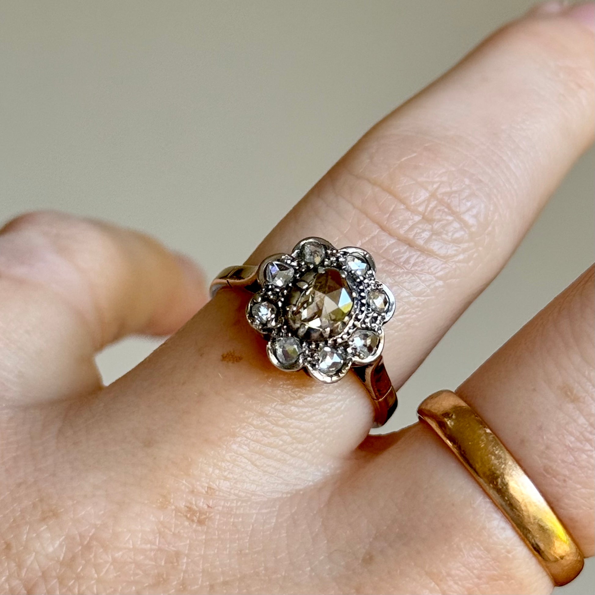 Encircling the centre is a halo of smaller round rose cut diamonds, each hand cut and uniquely shaped. Thus creating a halo that shimmers with quiet fire. The diamonds are set in silver, as was traditional of the period, to best enhance their brightness, while the band itself is created from warm 14 carat yellow gold The mixture of metals creating a beautiful contrast.