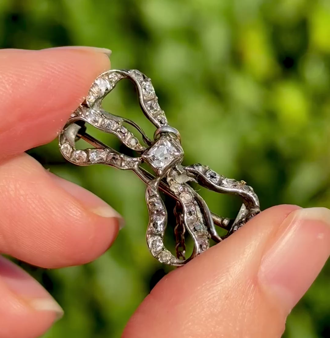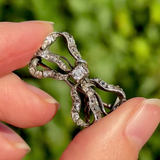 Every curve of the bow has been studded with old cut diamonds, their hand cut facets radiating a romantic, candlelit sparkle. At the heart of the piece lies a significant central diamond, anchoring the design and drawing the eye with its brilliance.