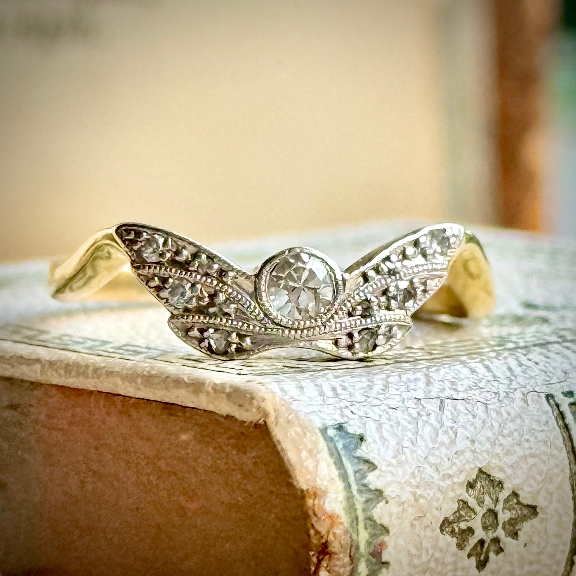 This exquisite ring is a rare example of early 20th century design at its most imaginative. Created in a striking combination of rich 18 carat gold and platinum, it captures the dreamy elegance that bridges the late Victorian era and the rise of Art Deco.