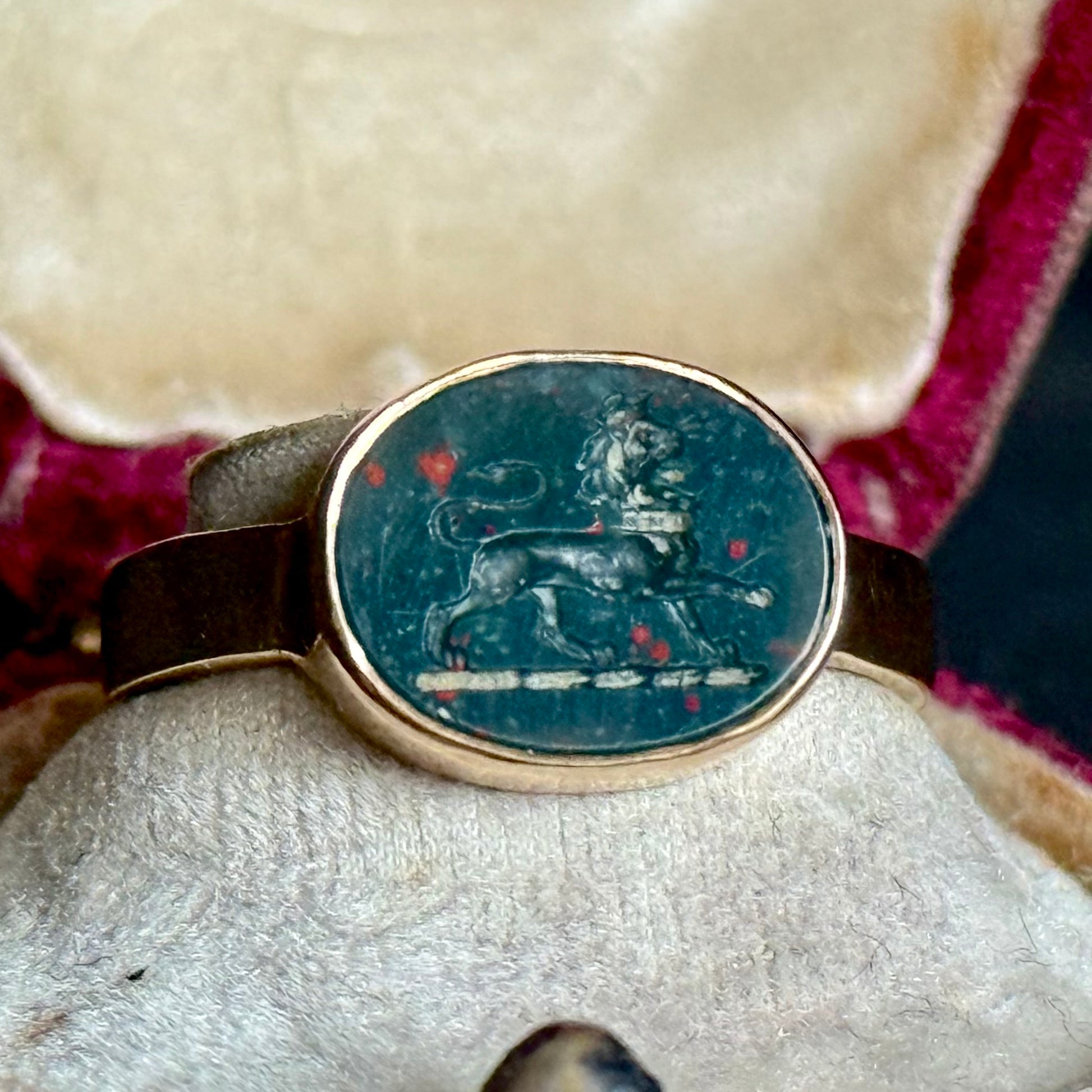 Antique Crowned Lion Bloodstone Ring in 9 Carat Gold