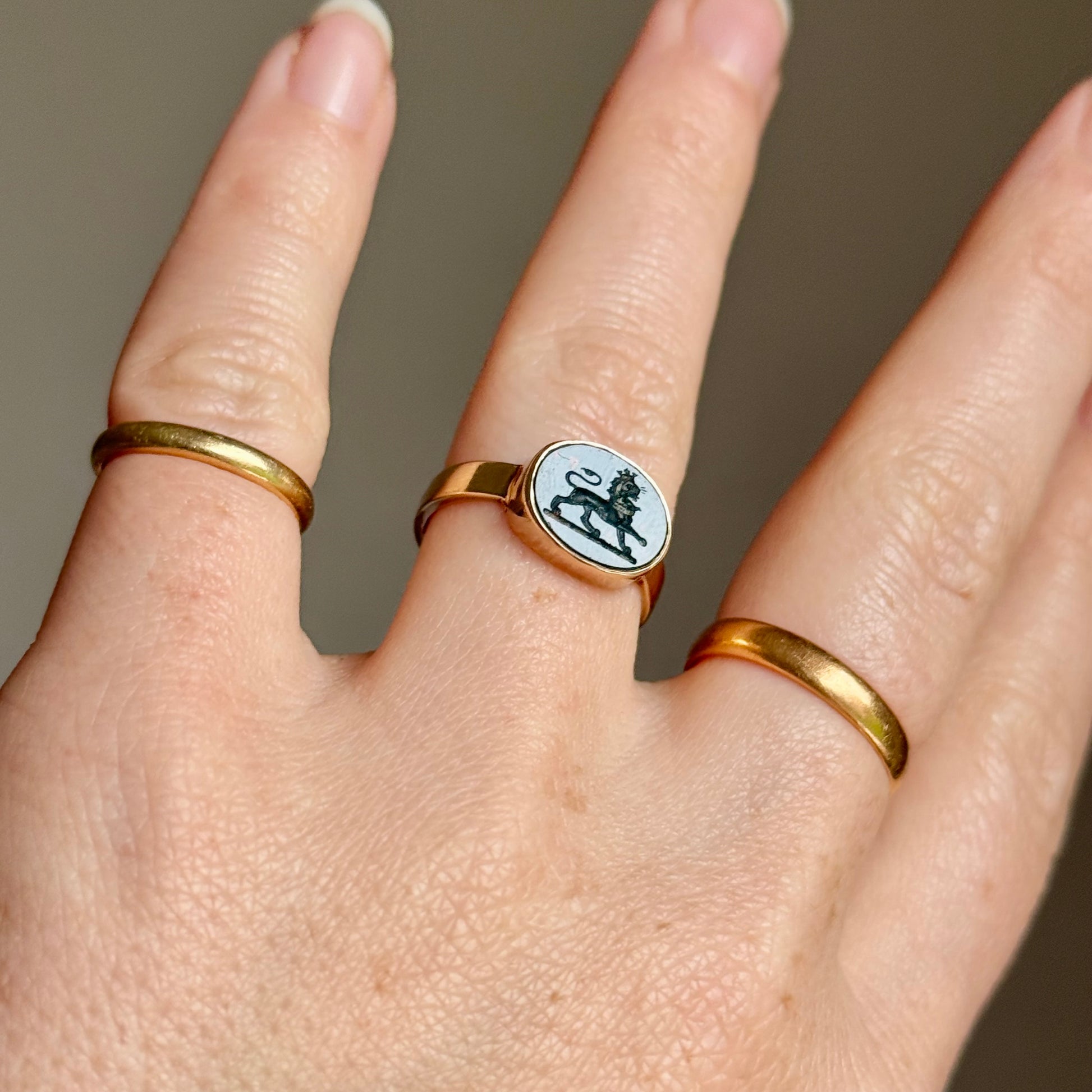 A striking antique ring crafted in 9 carat gold and set with an oval intaglio engraved with a richly detailed lion. The carving is beautifully ornate, capturing the lion’s full character. From its crowned head and flowing mane to the finely worked collar and the incised line suggesting a powerful roar.