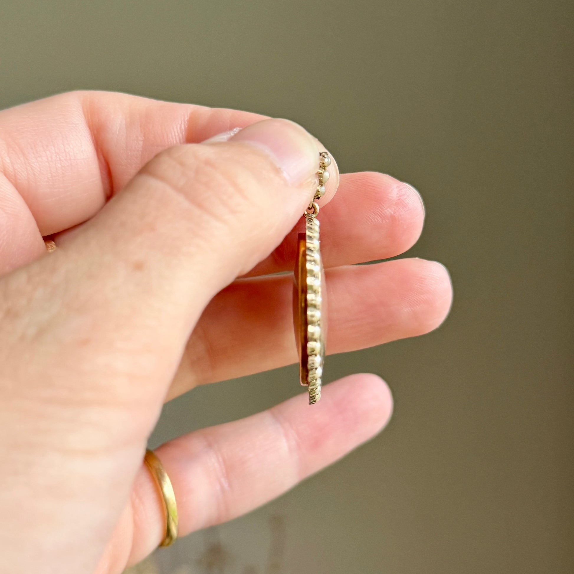 Encircling the locket is a luminous halo of natural seed pearls, symbolising devotion, a motif much loved in Edwardian and late Victorian jewellery. The pearl set loop adds an elegant finishing touch, allowing the piece to hang beautifully from a fine gold chain.