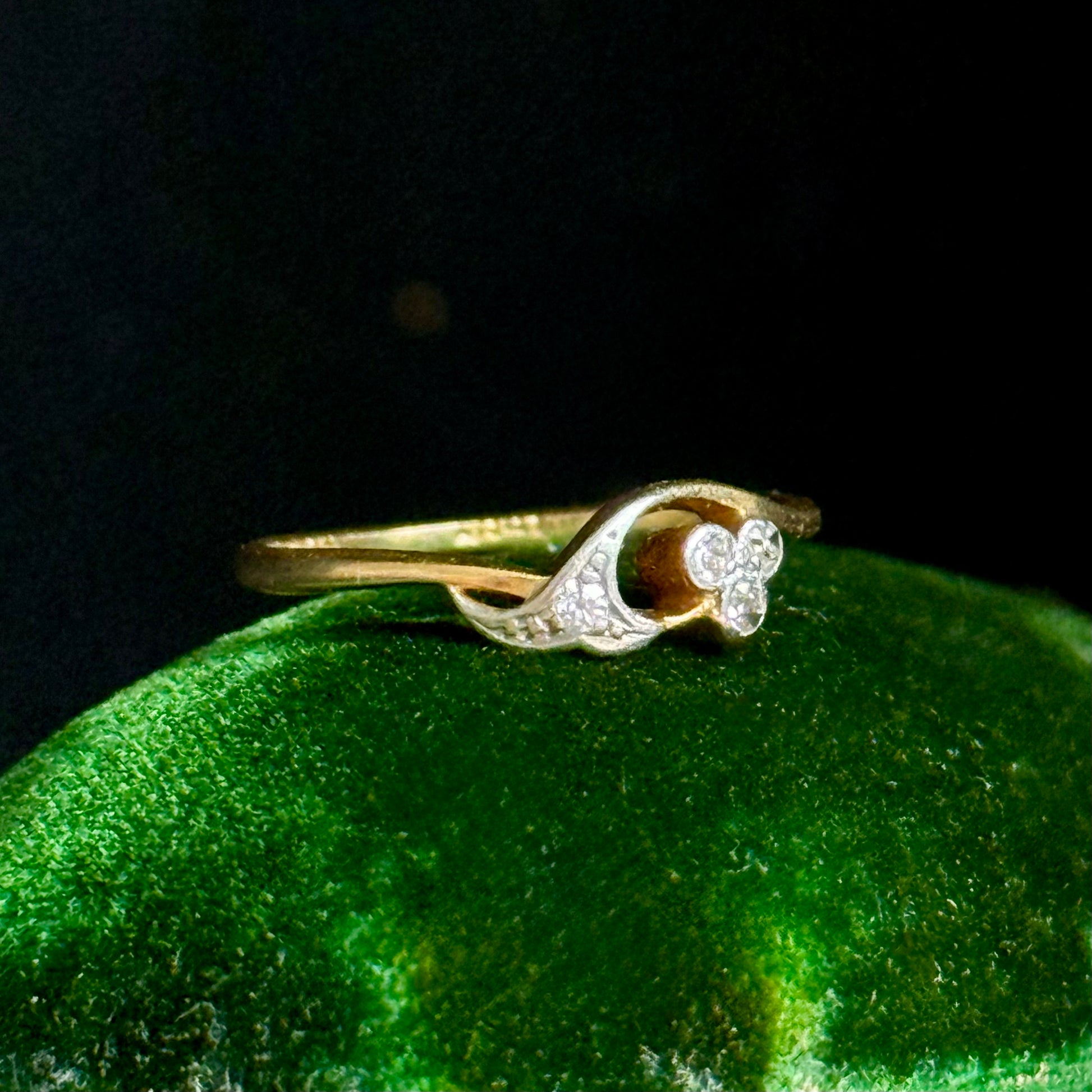An ethereal beauty from the turn of the century, this exquisite ring captures the delicate artistry of early 1900's design. Created in rich 18 carat gold, its top is fashioned as an asymmetrical floral motif. One side set with three glinting old cut diamonds, the other flowing into a graceful, swirl like leaf.