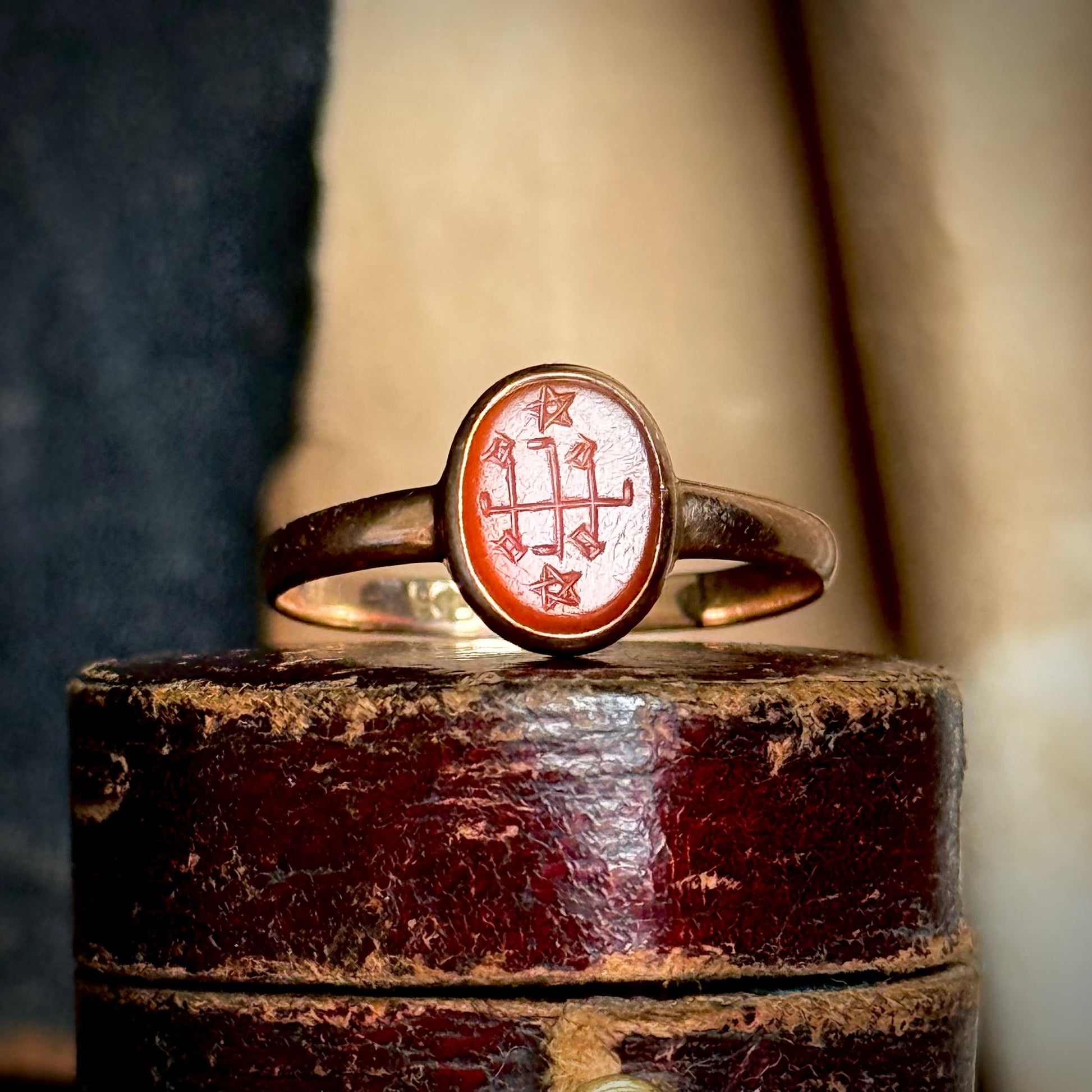 A deeply symbolic Edwardian intaglio ring, created in 18 carat gold and set with an oval carnelian, finely engraved with the Baha’i ring-stone symbol. The rich, warm orange red hue of the carnelian – long cherished for its associations with vitality, courage, and spiritual protection pairs beautifully with the simplicity of the gold mount.