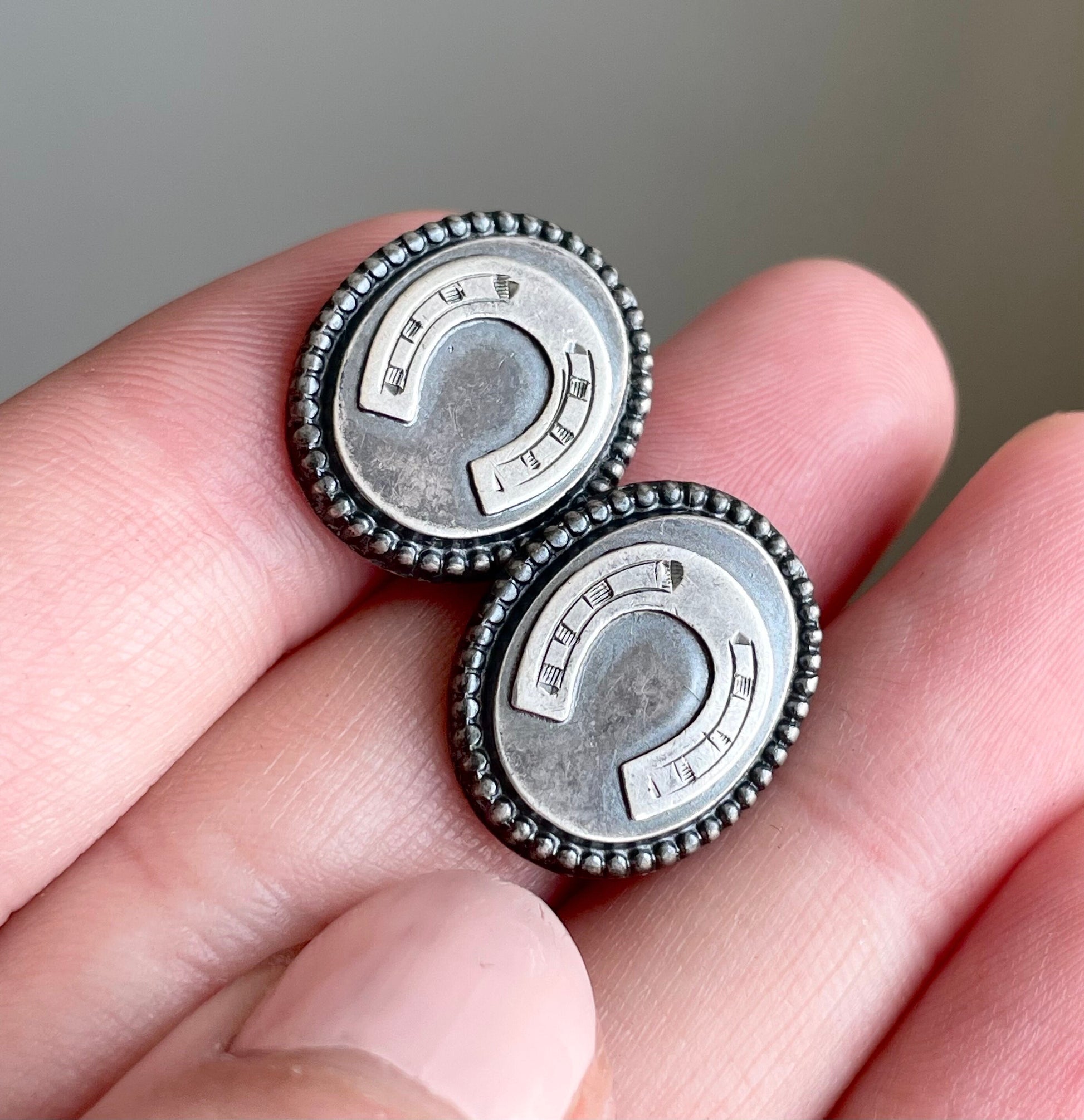 Created from sterling silver they have a lovely patina to them with the horseshoe standing out against the back ground. They are attached with silver bars meaning they're nice and easy to put on and take off.