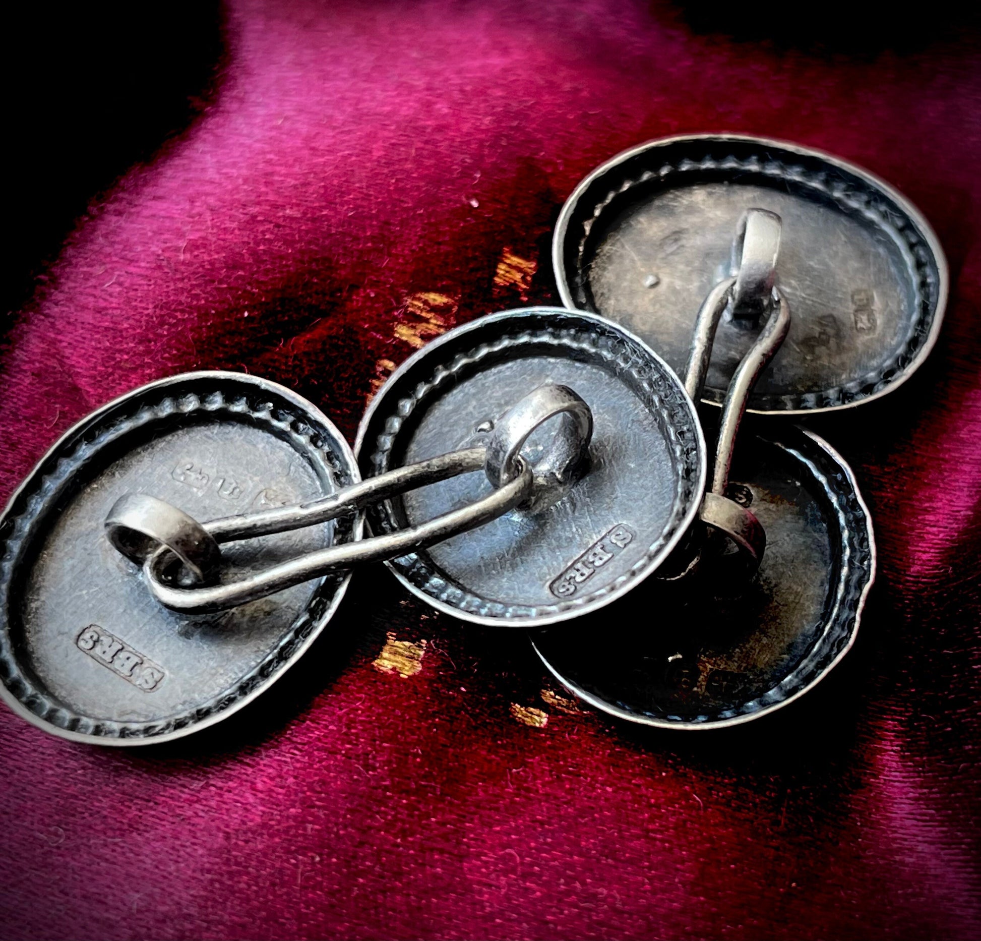 Each cufflink pair consists of two oval panels onto which has been added a horseshoe. Synonymous with luck, thesis would have been worn to bring property and luck to their first owners; possible a gift from a loved one!